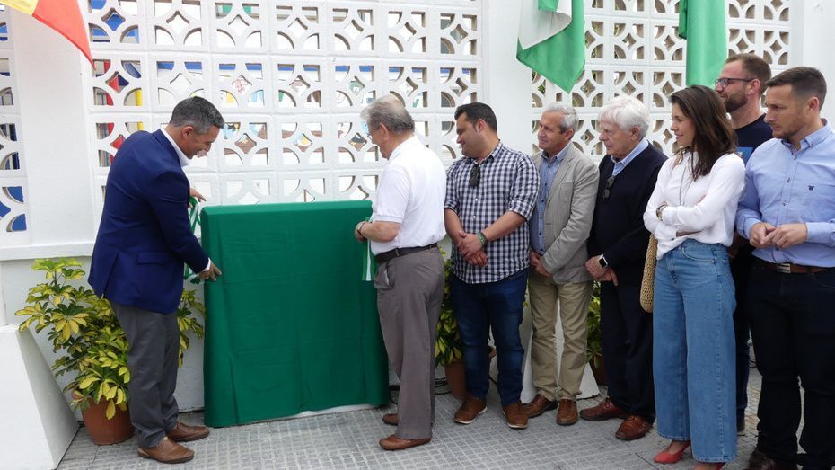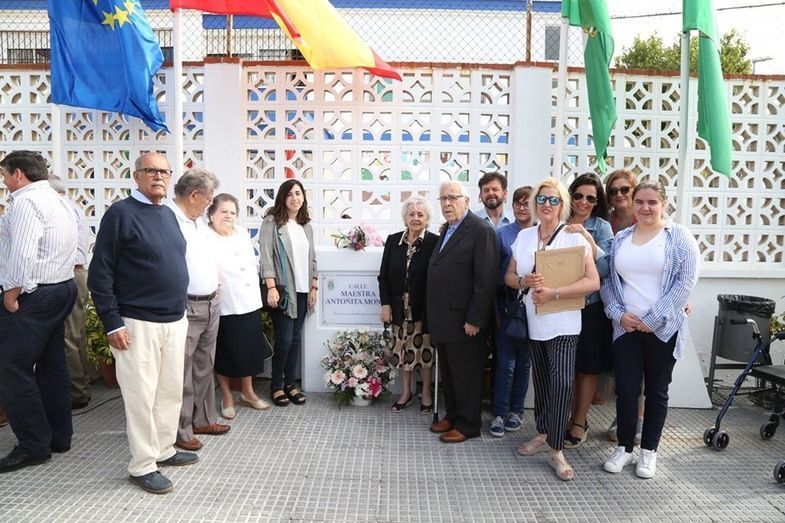 La calle "Maestra Antoñita Monge", situada donde está el colegio Azorín en el que pasó su vida laboral, ha quedado rotulada tras el descubrimiento de un monolito que han destapado el alcalde de Rota en funciones, Javier Ruiz, y el esposo de la homenajeada, Carlos Margarito López.