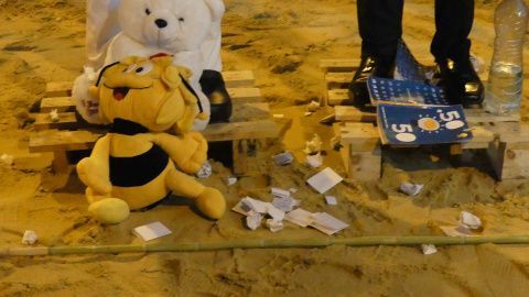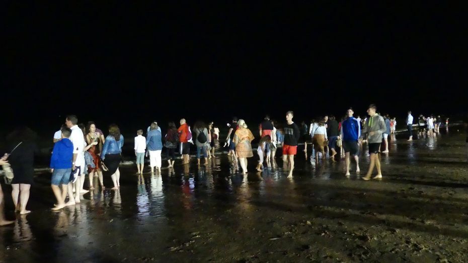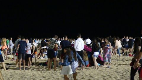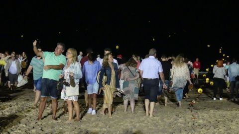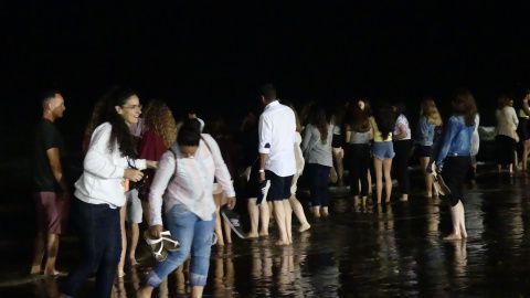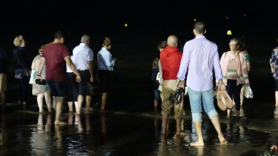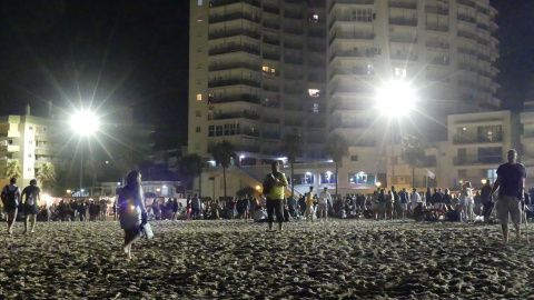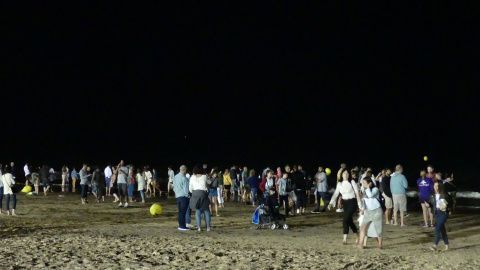Como es habitual, y tras quedar reducidos en cenizas todos los "juanillos", la música comenzó a sonar y los roteños y visitantes cumplieron con la tradición de irse a la playa para mojarse los pies y pedir un deseo. Aunque había humedad y la noche no era del todo calurosa, los hubo que también se dieron un rápido chapuzón, pero la mayoría optó por descalzarse y llegar hasta la orilla. Para facilitar el paso de cientos de ciudadanos, se iluminó con focos la playa de la Costilla permitiendo que algunos, los más jóvenes, montaran su propia fiesta de San Juan.