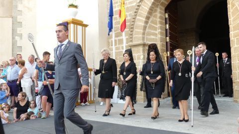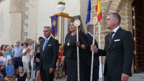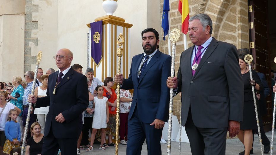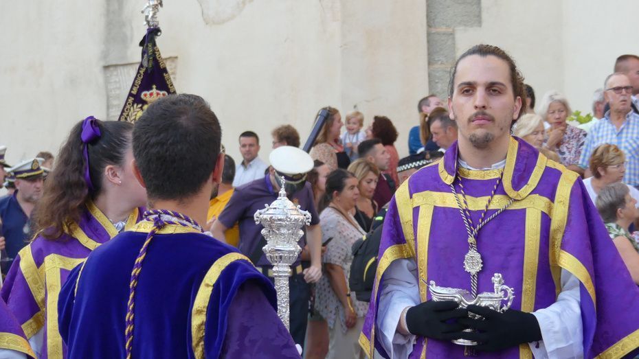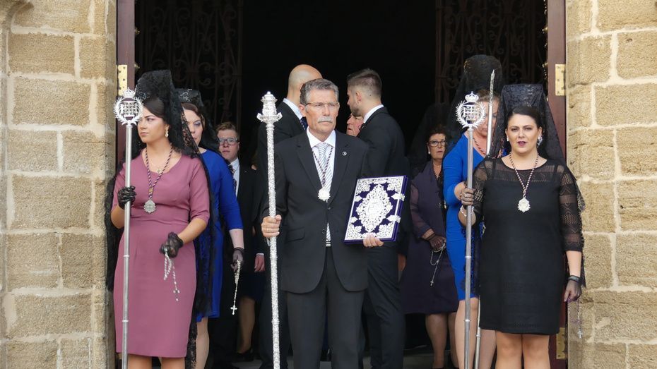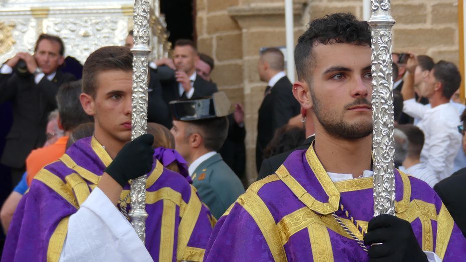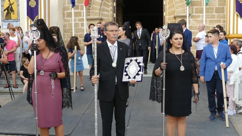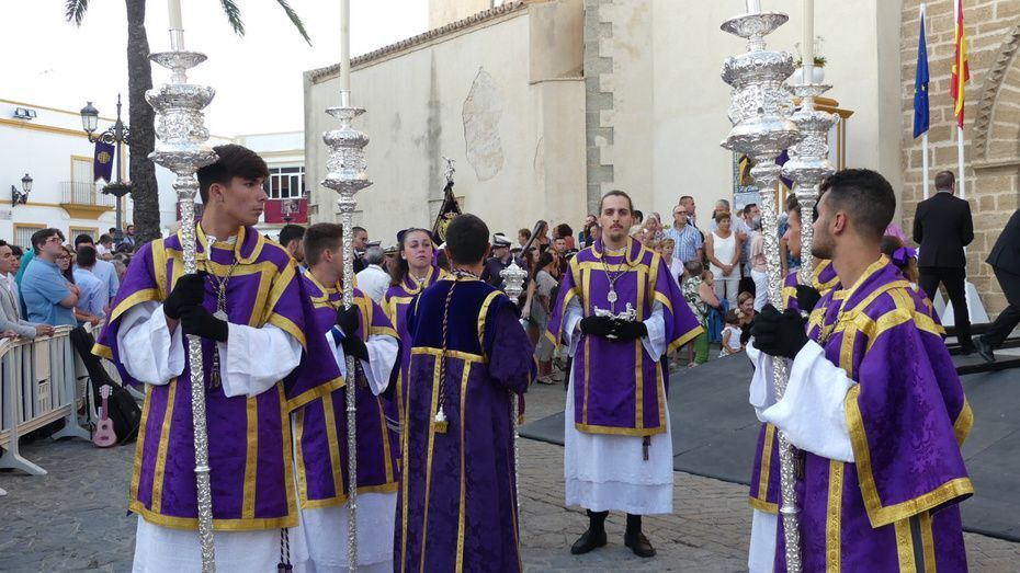 Entre los estrenos, se ha podido ver la túnica morada del Señor de Rota, la réplica del guion corporativo de la hermandad, un pañuelo que llevaba la virgen, el juego de faldones y broches para el paso de palio, la restauración de varios enseres y el sobre techo del palio.