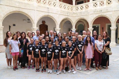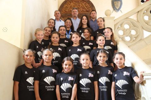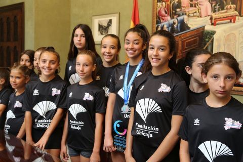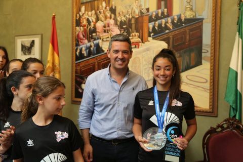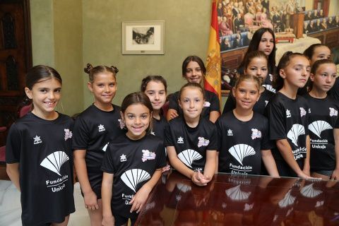 Las alumnas de los tres conjuntos federados de la EFI Meva, correspondientes a las categorías promesas, precopa y copa, han sido recibidas esta mañana por el alcalde de Rota, Javier Ruiz, una vez que ha terminado la temporada de forma exitosa para ellas. Ha sido la segunda recepción oficial que hoy ha ofrecido el regidor roteño a jóvenes deportistas de la localidad, primero al futbolista Juan María Alcedo, y posteriormente a las chicas de la EFI entre las que se encontraba Sara Arana, subcampeona de Andalucía en San Pedro de Alcántara en la categoría precopa de gimnasia rítmica.