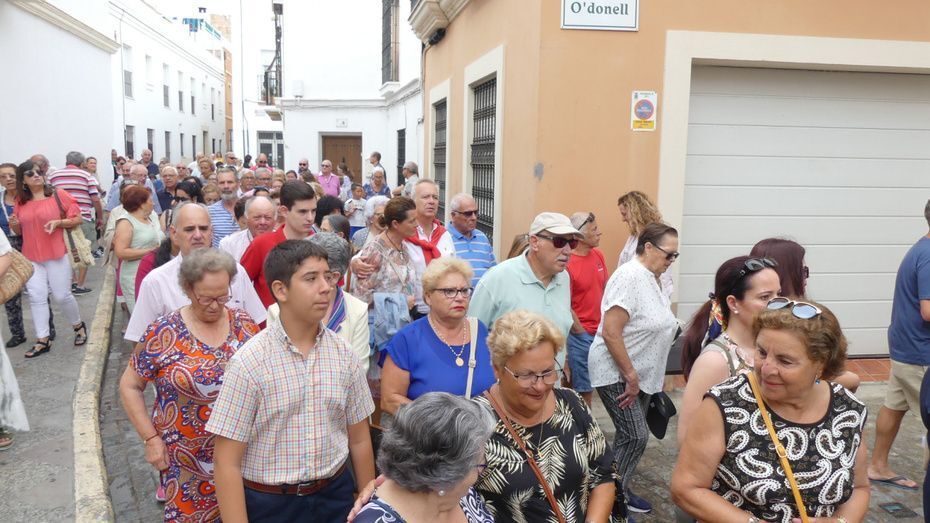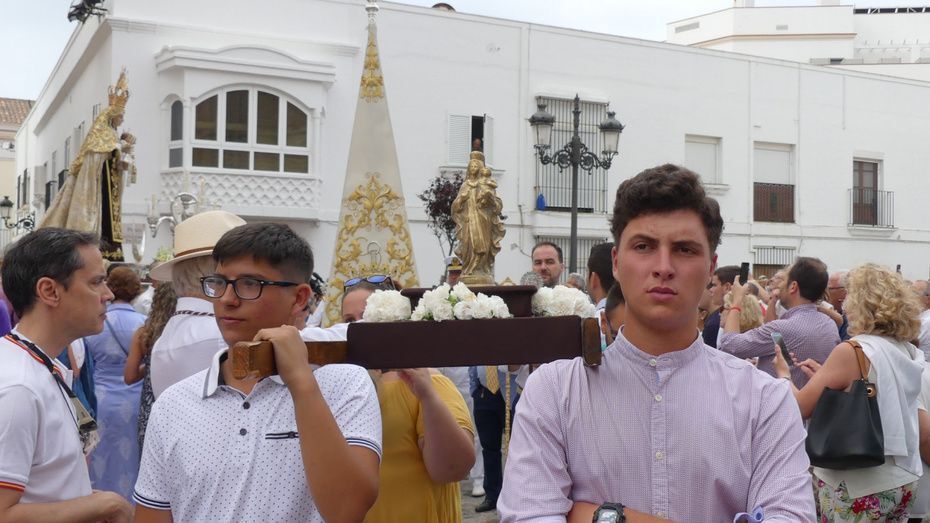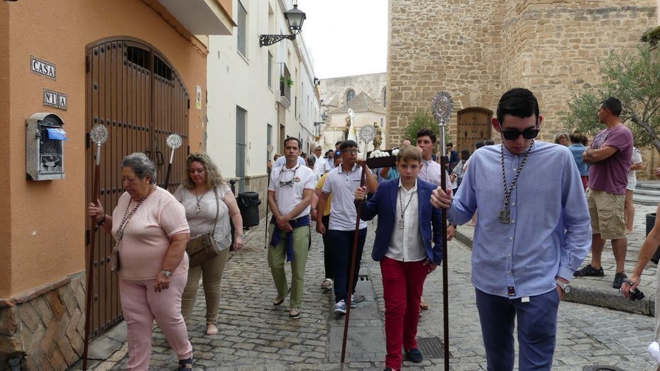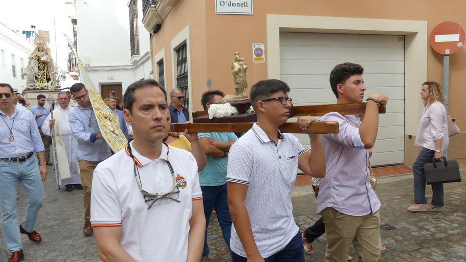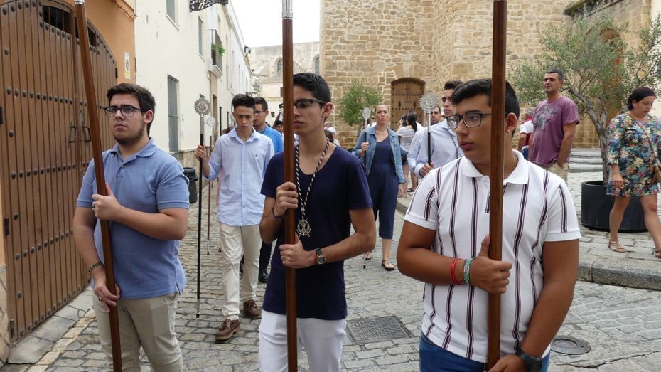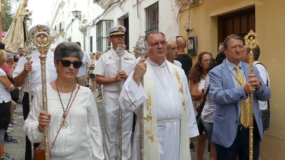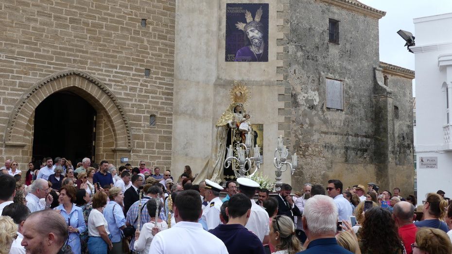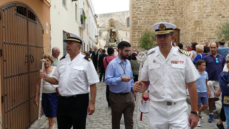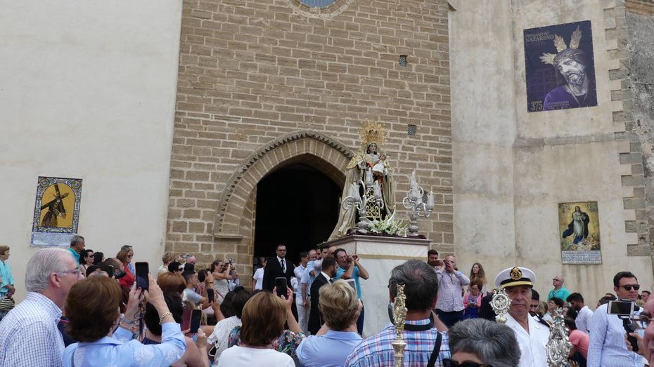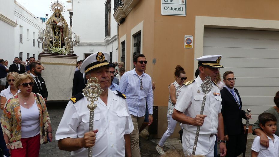 Muchos roteños y sobre todo, turistas, se han acercado hasta la plaza Bartolomé Pérez para acompañar a la patrona de los marineros en este rezo por las calles cercanas a la parroquia de Nuestra Señora de la O desde donde ha partido en torno a las 10. Abriéndole paso a la parihuela que la ha portado durante la hora que ha durado el rezo del Vía Lucis, se ha podido ver una comitiva formada por unas 40 personas, entre los que estaban jóvenes hermanos de la Hermandad del Carmen de Rota portando varas e insignias, entre ellas, el estandarte que este año se estrena; el cura párroco de la O y director espiritual de la hermandad, José Arjona Gil, la hermana mayor, Rosa María Sánchez, el presidente del Consejo Local de Hermandades y Cofradías, José Antonio Rodríguez, representantes de la Armada española, de la que es patrona la virgen, y tras ellas, muchos hermanos acompañándola en este día especial.