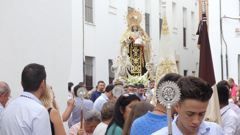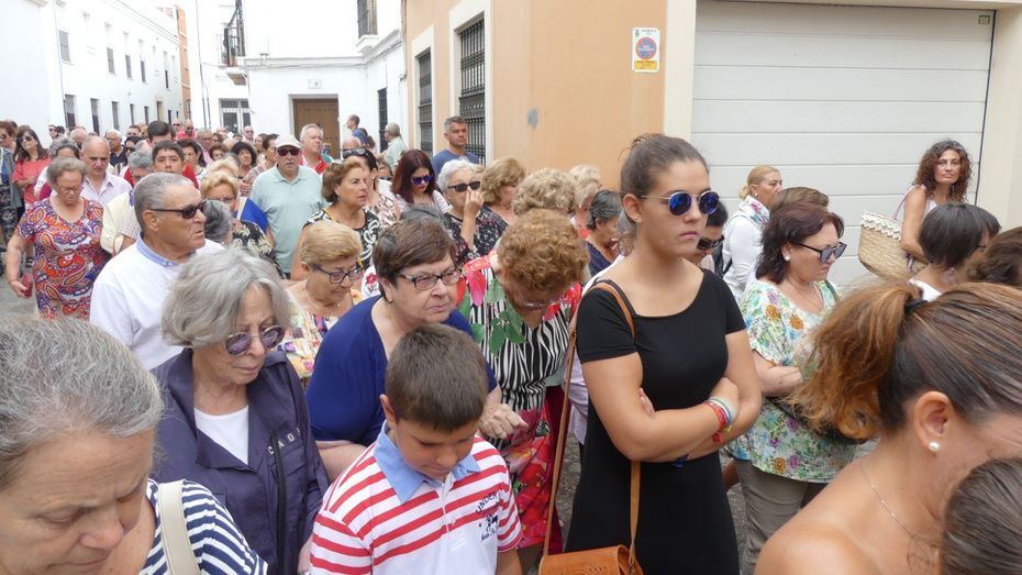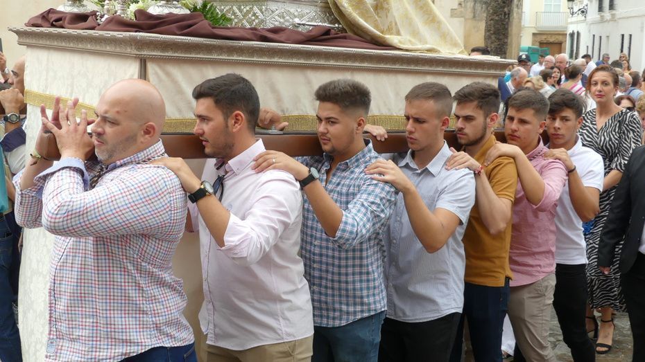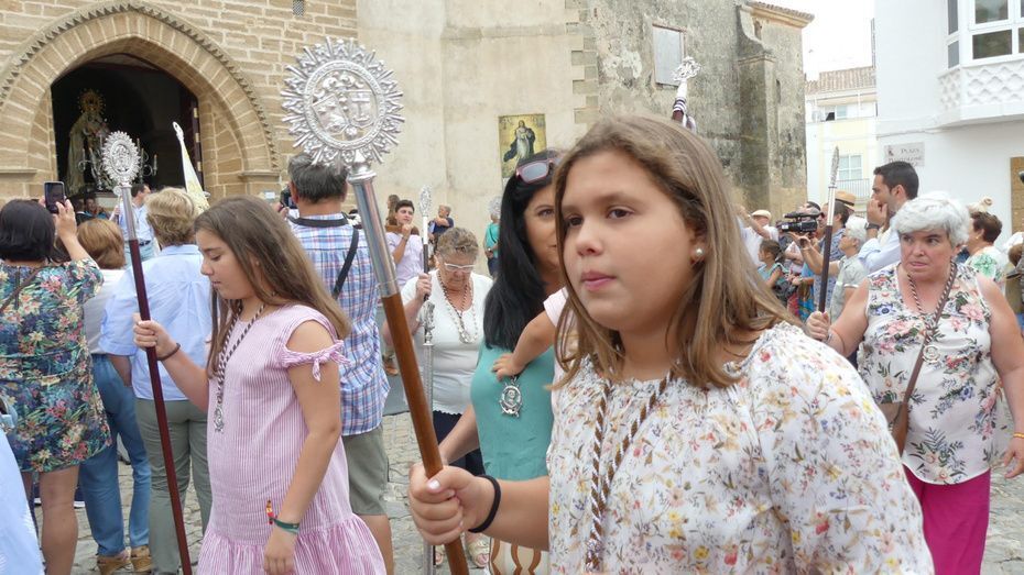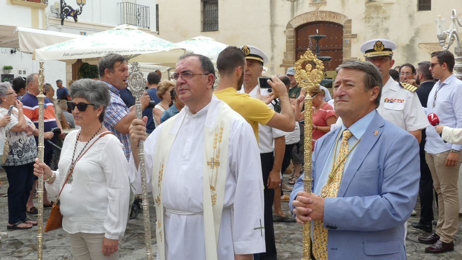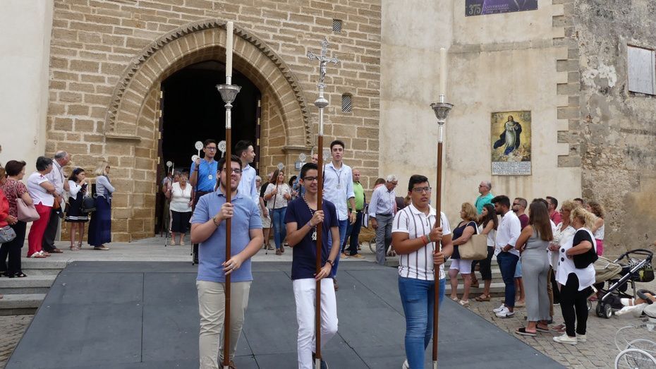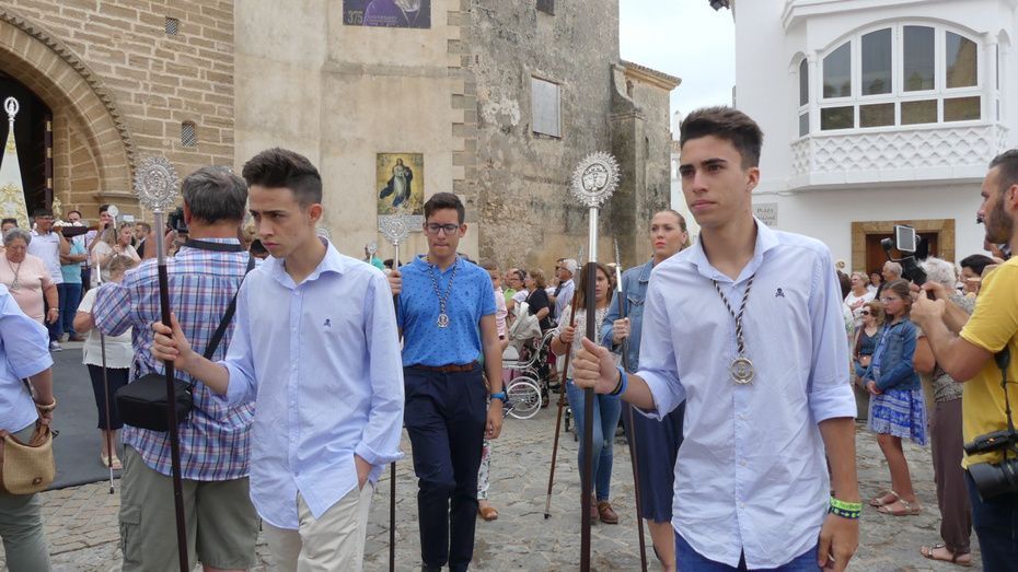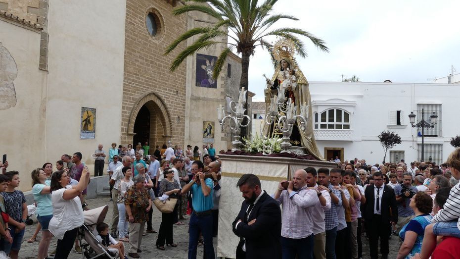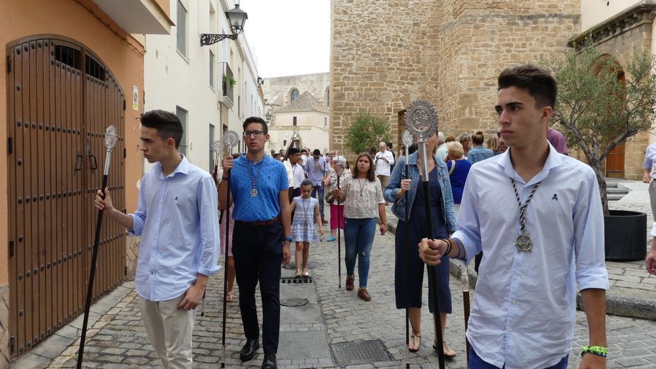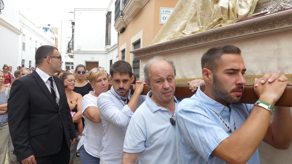 Muchos roteños y sobre todo, turistas, se han acercado hasta la plaza Bartolomé Pérez para acompañar a la patrona de los marineros en este rezo por las calles cercanas a la parroquia de Nuestra Señora de la O desde donde ha partido en torno a las 10. Abriéndole paso a la parihuela que la ha portado durante la hora que ha durado el rezo del Vía Lucis, se ha podido ver una comitiva formada por unas 40 personas, entre los que estaban jóvenes hermanos de la Hermandad del Carmen de Rota portando varas e insignias, entre ellas, el estandarte que este año se estrena; el cura párroco de la O y director espiritual de la hermandad, José Arjona Gil, la hermana mayor, Rosa María Sánchez, el presidente del Consejo Local de Hermandades y Cofradías, José Antonio Rodríguez, representantes de la Armada española, de la que es patrona la virgen, y tras ellas, muchos hermanos acompañándola en este día especial.
