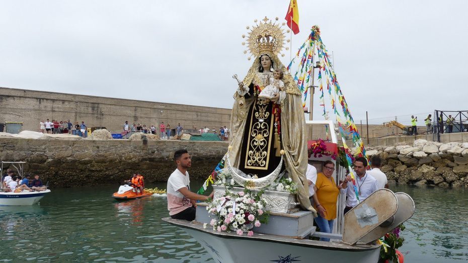 Aunque hoy las temperaturas no son altas y el cielo está encapotado, los bañistas que se han bajado a la playa temprano han podido disfrutar del paseo de la virgen que sobre las 12.30 estaba previsto que volviera a su capilla donde la prepararán para esta tarde, a las 20.00 horas, realizar su procesión por las calles del casco antiguo.