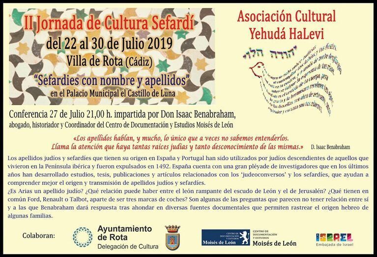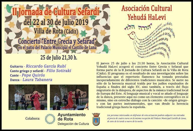 [Img #118975]La cultura sefardí tendrá su espacio también este verano en Rota gracias a unas jornadas que comenzarán esta tarde y que acabarán el próximo martes 30 de julio gracias a la Asociación Cultural Yehudá HaLevi que, con la colaboración de la delegación de Cultura, ha organizado varias sesiones de conferencias, proyecciones, concierto y recital.