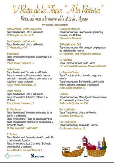 Desde hoy jueves 1 de agosto hasta el lunes día 12, desde el Ayuntamiento han realizado una propuesta atractiva en la que se pretende ofrecer calidad gastronómica tanto a los vecinos de la villa como a los turistas que estén pasando sus vaciones en Rota, degustando una gran variedad de tapas a la roteña.
