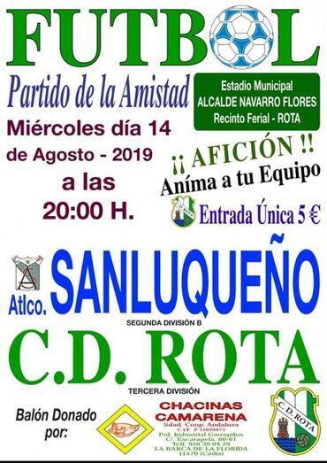El próximo Miércoles el CD Rota cerrará su pretemporada frente al que posiblemente sea el rival más duro de la pretemporada, el Atlético Sanluqueño de Segunda División B que nos visitará en el Navarro Flores el próximo miércoles 14 a las 20:00 horas.