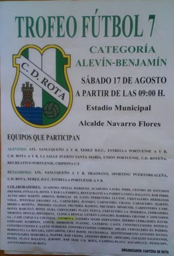 El CD Rota, organizador del campeonatoEl pasado sábado 17, desde las 9.00 horas, se disputó el Trofeo de fútbol 7 en categoría Alevín y Benjamín que organizó el CD Rota en el estadio municipal Alcalde Navarro Flores. En este torneo, participaron 20 equipos, de los cuales 12 eran de categoría Alevín y los 8 restantes compitieron en categoría benjamín.