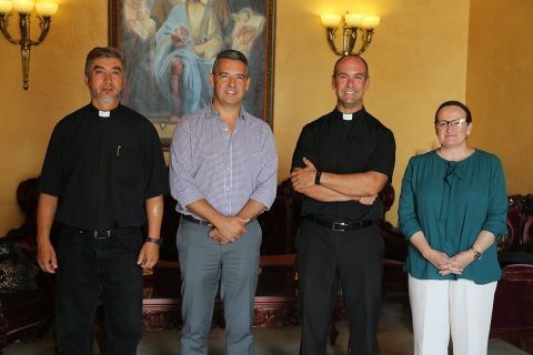 El alcalde de Rota, José Javier Ruiz Arana, acompañado de la Teniente de Alcalde Encarna Niño Rico, ha recibido esta mañana en la alcaldía situada en el Castillo de Luna al párroco de Nuestra Señora del Carmen y Nuestra Señora del Rosario Coronada de Costa Ballena, Carlos Redondo, con motivo de su despedida al haber recibido un nuevo destino.