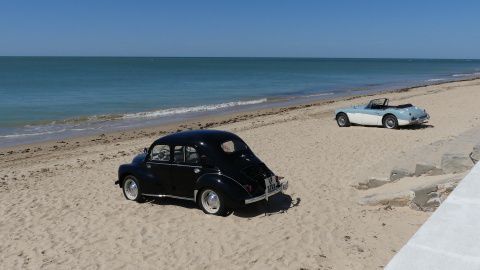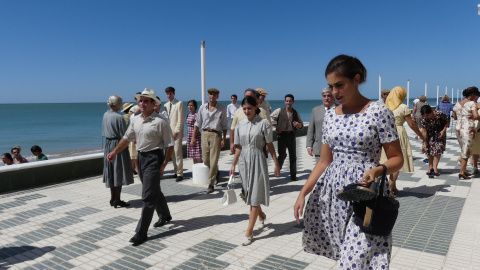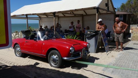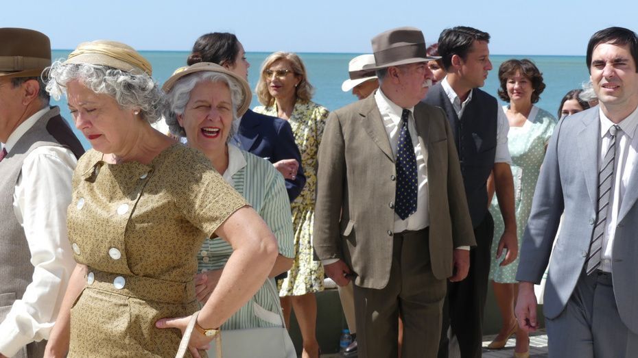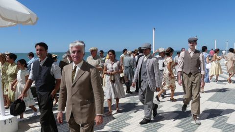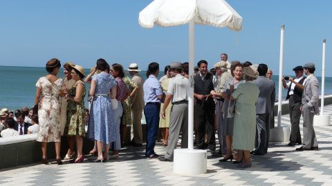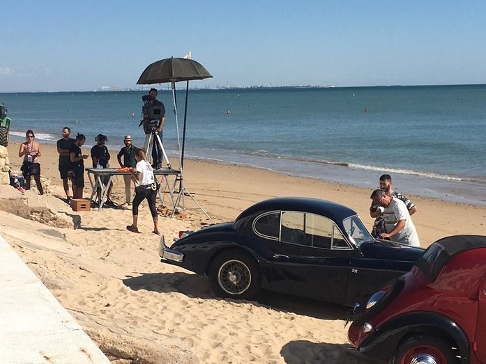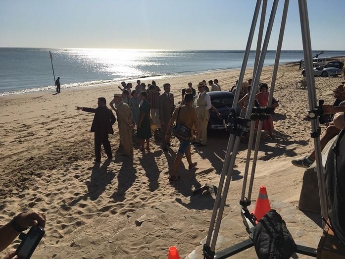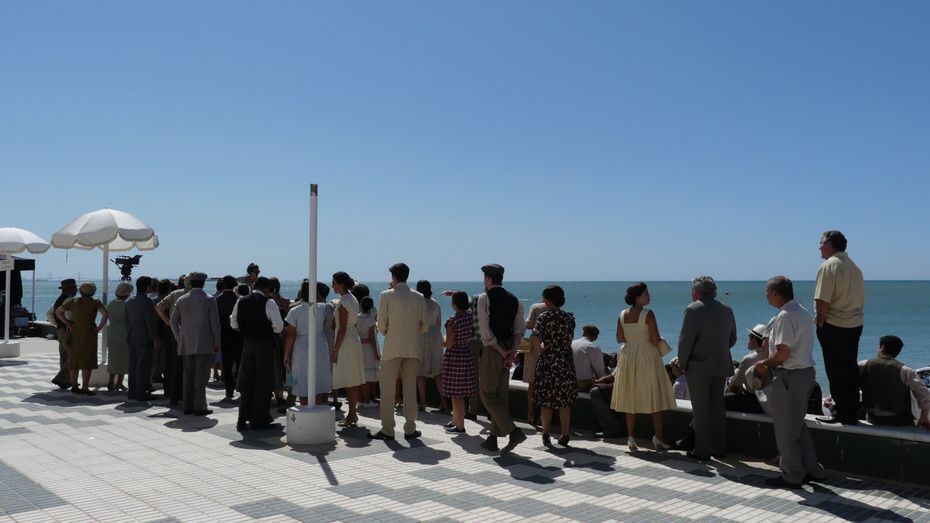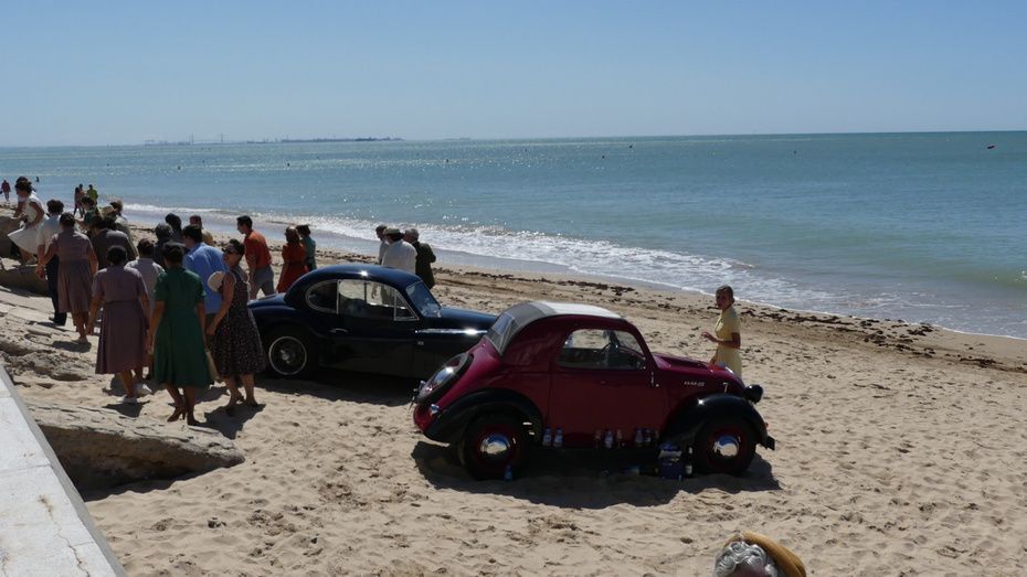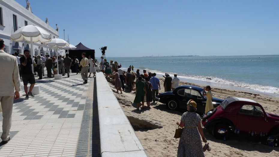 Coches clásicos en plena playa y decenas de extras recreando la vestimenta de los años 50 se han podido ver en la jornada de hoy en la que pese al viento que sopla, hay calor, lo que hace menos placentero el trabajo.