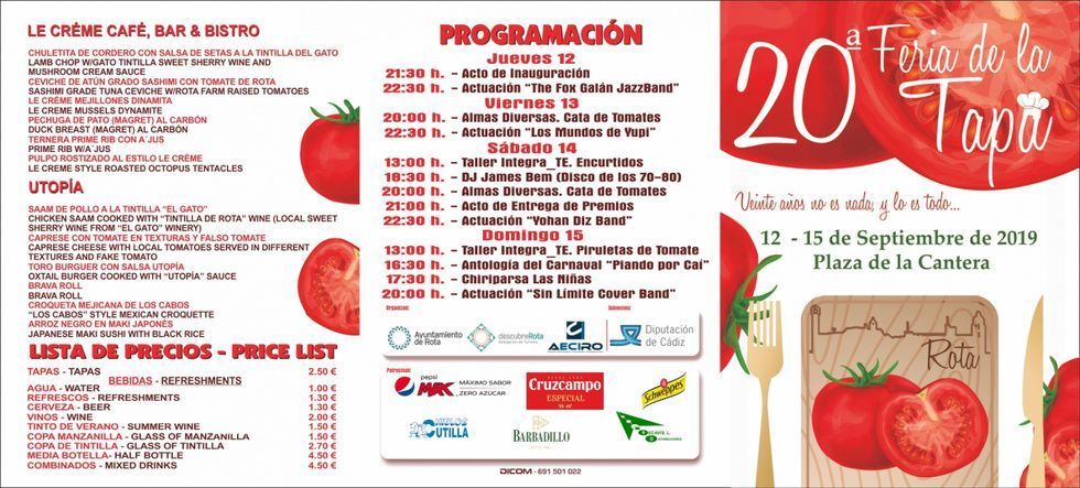 A las 21.30 horas está previsto que se celebre el acto de inauguración que este año contará con la presencia de Ricardo Cutilla como padrino del evento, miembro, gerente y socio de Hermanos Cutilla Distribuidora Cruzcampo, una empresa que además de colaborar durante años con esta feria tiene en esta edición una destacada participación con la presencia de la Fundación Cruzcampo que colabora con una iniciativa solidaria. Y es que como ya se dijo el día de la presentación, este año desde un stand en el que estará la Fundación Cruzcampo, se venderá la Tapa Solidaria a favor de la asociación local APSI, que trabaja por la integración de niños con necesidades especiales. Todos los ingresos que se consigan por la veta de esta tapa que será un arranque roteño, irán destinados a esta entidad. Con ellos colaborará la sociedad "Alma de tomate" que aporta lo ingredientes además de proponer varios talleres a los que los interesados se pueden apuntar media hora antes de su inicio. Los talleres previstos son el viernes 13 a las 20.00 horas una cata de tomates; el sábado 14 a las 13.00 horas el taller de encurtidos; el mismo día a las 20.00 horas una nueva cata de tomates; y el domingo a las 13.00 horas, el taller de piruletas de tomate.