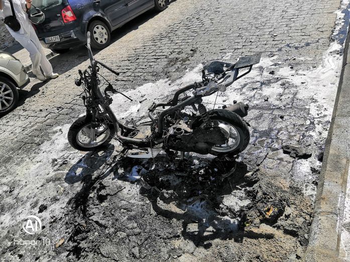 De forma inmediata, el ciclomotor ha comenzado a arder hasta quedarse en el chasis, posiblemente, por la conjugación del líquido que ya había en el asfalto y el rozamiento de la moto con la carretera podría haber provocado alguna chispa que habría desatado el fuego.