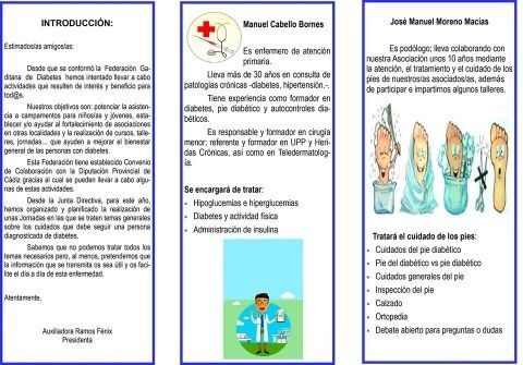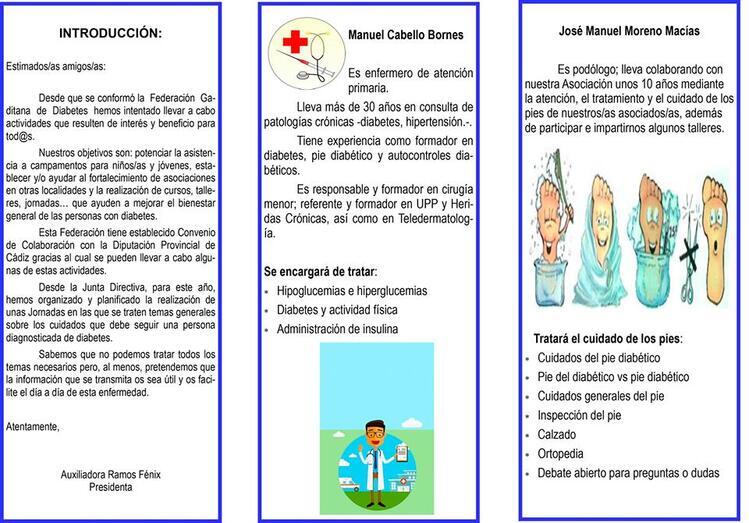Para ello, esta entidad local propone varias charlas y temas a tratar para los que contarán con el DUE -especialista en diabetes- Manuel Cabello Bornes, el podólogo José Manuel Moreno Macías, y la nutricionista, María González Pacheco.