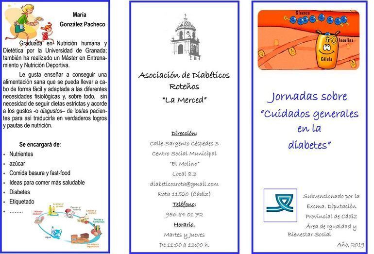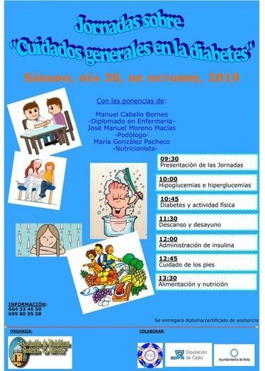 De cara a este sábado, 26 de octubre, la asociación de diabéticos de Rota "La Merced", el salón multiusos del Palacio Municipal Castillo de Luna acogerá unas jornadas informativas en las que se abordarán temas generales sobre cuidados en las diabetes. Se trata de un variado programa que servirá al diabético para conocer en qué aspectos debe prestar mayor atención una vez que ha sido diagnosticado.