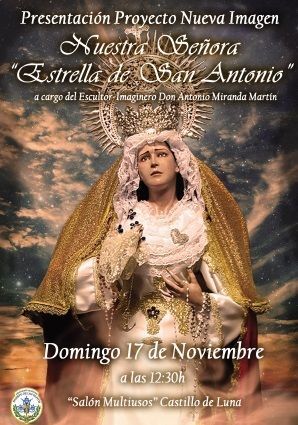 La imagen de la Estrella de San Antonio, dolorosa que se sumó como titular de la Asociación Cultural "Huerto de los Olivos" el Sábado de Pasión de la Semana Santa de 2017, será sustituida a medio plazo por una nueva imagen. Precisamente, para compartir con los roteños este nuevo proyecto de la asociación que apuesta por ir dando pasos en serio para poder llegar algún día a formar parte de las comitivas que desfilan en Semana Santa, este domingo, 17 de noviembre, se presentará el proyecto de la nueva talla que correrá a cargo del imaginero Antonio Miranda Martín. Será él mismo el que presente y dé detalles de su futura obra para "Huerto de los Olivos".