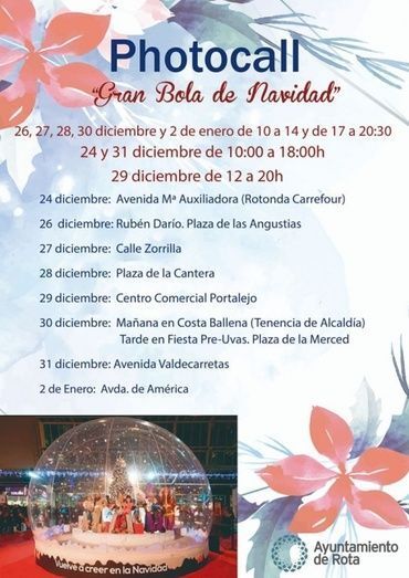 Además, y con la intención de animar a la gente a salir a la calle, aparte del mapping de esta tarde en la plaza de la Merced, mañana 24 de diciembre iniciará su recorrido por las calles el 'photocall' de la Gran Bola de Navidad, un hinchable en el que los ciudadanos podrán meterse dentro para fotografiarse y llevarse una bonita estampa navideña. Estará mañana 24 en la rotonda de María Auxiliadora, el día 26 en la calle Rubén Darío en la plaza de las Angustias, el día 27 en la calle Zorrilla, el 28 en la plaza de La Cantera, el 29 en el Centro Comercial Portalejos, el día 30 en la Tenencia de Alcaldía de Costa Ballena por la mañana y en la plaza de la Merced, durante la fiesta pre-uvas por la tarde; seguirá su itinerario el día 31 en la avenida Valdecarretas y el día 2 de enero en la avenida de América.