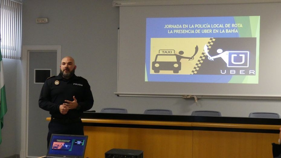 El curso, impartido por Antonio Ortega, policía reconocido y muy formado en este ámbito, se ha desplazado a Rota para ofrecer durante tres horas esta charla formativa en la que han participado más de una veintena de policías además de haber invitado a dos miembros de la Asociación de Autoturismos de Rota para que el sector del taxi, uno de los más interesados por el conflicto surgido en otras ciudades, pudiera también recibir la información.