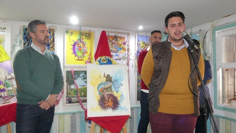 El autor ha sido Jonathan Alonso, en quien la peña "El Camaleón" confió hace unos meses haciéndole un encargo que hoy han podido ver todos. Un cartel donde predominan los colores azul y amarillo como buen seguidor del Cádiz CF, y donde el cartelista ha incluido varios homenajes. Dado que era un año difícil para él, por las pérdidas de grandes del Carnaval que se han marchado hace muy poco, en su obra los ha querido tener presentes. Como base de la imagen, se puede ver un gran erizo abierto, con un camaleón muy cerca, dos elementos que no pueden faltar en cualquier cartel de esta Erizá que se precie. Completan el dibujo la presencia de dos carnavaleros gaditanos que se han marchado hace meses como Juan Carlos Aragón y Manolito Santander, y homenaje al roteño Francisco Gutiérrez "Guti", cuyo monumento en el paseo marítimo del Rompidillo cumple ahora diez años. El detalle con el deporte y amor por el Cádiz lo representa en esta ocasión José Mari, futbolista roteño del equipo amarillo y capitán del mismo. Una mezcla que el propio autor, que descubría el cartel junto al alcalde de Rota, Javier Ruiz, espera que haya gustado asegurando que él le ha puesto mucha ilusión en confeccionarlo y buscar una idea que diera cabida a sus pasiones, la carnavalera y la cadista.