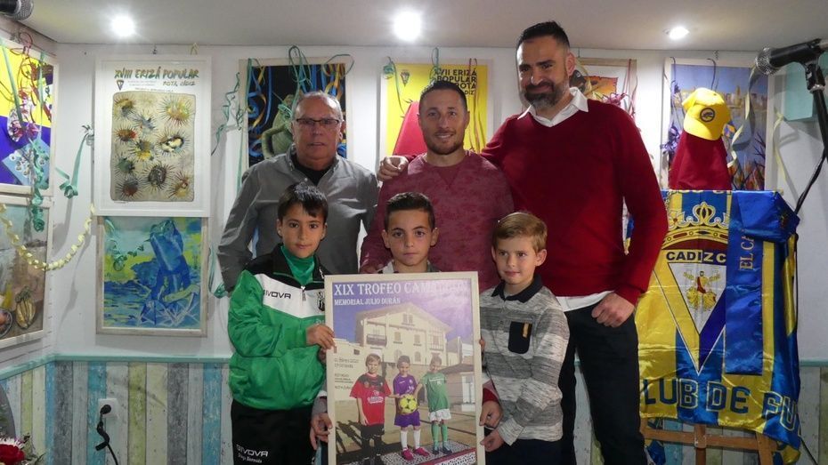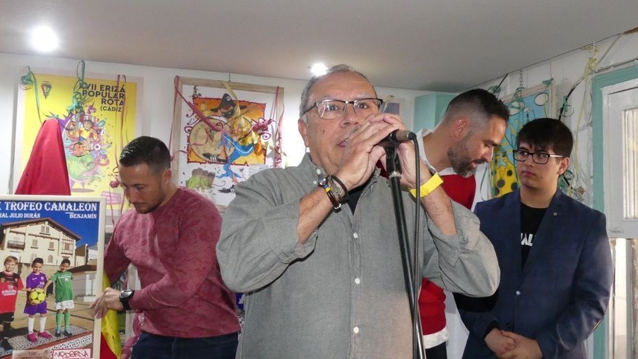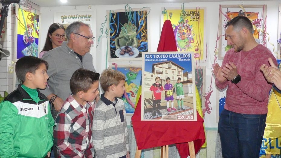 En realidad, el descubrimiento del cartel, aunque es la parte principal del acto, fue lo último que se hizo. Antes, como siempre, se le da su sitio al deporte base con la presentación del cartel del XIX Trofeo Camaleón "Memorial Julio Durán". La foto, obra del socio Leopoldo Almisas, recoge a tres jugadores de los tres equipos de la localidad, el CD Rota, la UD Roteña y el CD Rosario. Este año, como escenario se ha elegido el paseo marítimo de la Costilla y en concreto, la zona de la conocida como "casita de chocolate" porque como decía el propio autor, los monumentos se están acabando dado todas las ediciones ya celebradas. Este cartel es además de una apuesta por el deporte base, un homenaje a uno de los socios más queridos de esta peña, Julio Durán, al que le dedican el trofeo cada año recordando su pasión por el fútbol y el Cádiz CF.