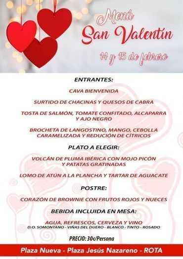 El Menú San Valentín comenzará con una copa de cava de bienvenida, un surtido de quesos de cabra y chacinas, una tosta de salmón, tomate confitado y alcaparra y ajo negro; y una brocheta de langostino, mango, cebolla caramelizada y reducción de cítricos. Para el plato principal, el comensal podrá elegir entre volcán de pluma ibérica con mojo picón y patatas gratinadas o lomo de atún a la plancha y tartar de aguacate. El postre será un brownie con frutos rojos y nueces, estando incluida toda la bebida en mesa (agua, refrescos cerveza y vino (D.O. Somontano, Viñas del Duero, Blanco, Tinto y Rosado).