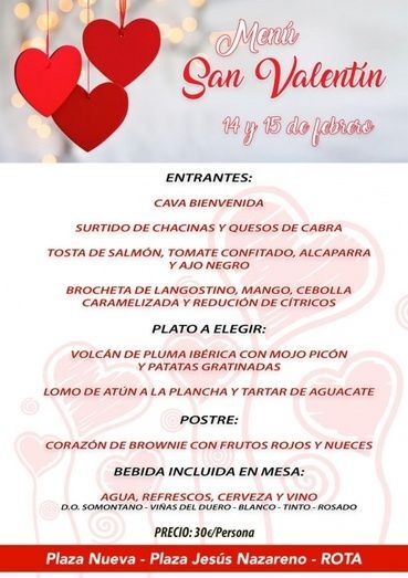 La idea es ofrecer a los comensales un menú cerrado compuesto por entrantes, plato principal a elegir, postre y bebidas incluidas al precio de 30 euros por persona, que se podrá degustar los días 14 y 15 de febrero, ya que al coincidir este día de los enamorados en viernes, se aprovecha para alargar la promoción al fin de semana.