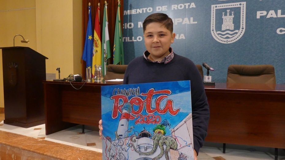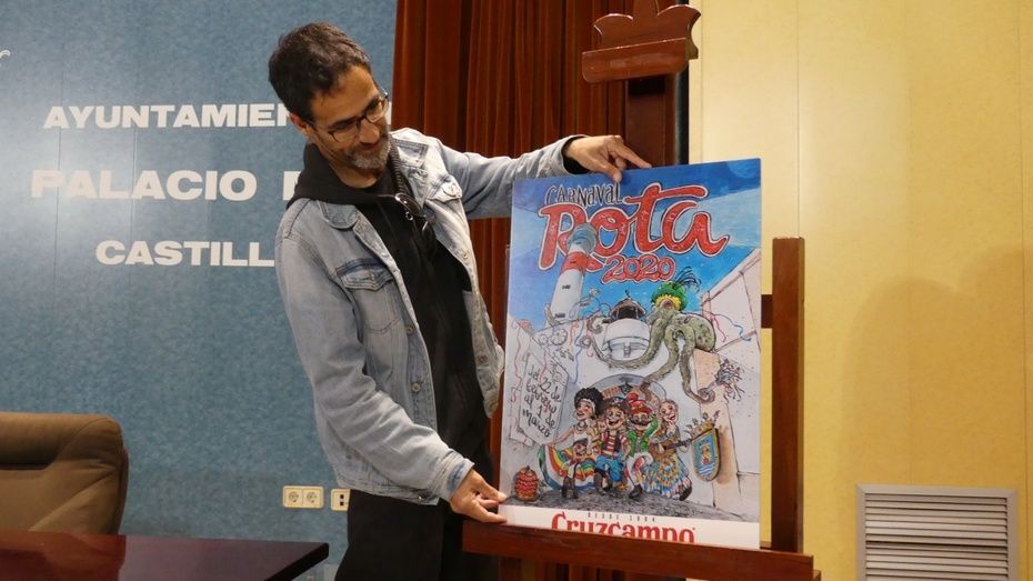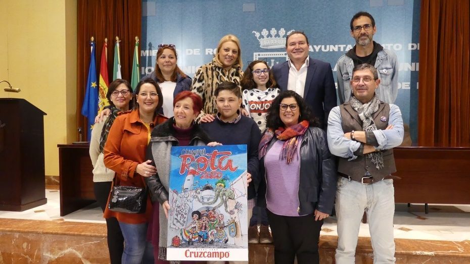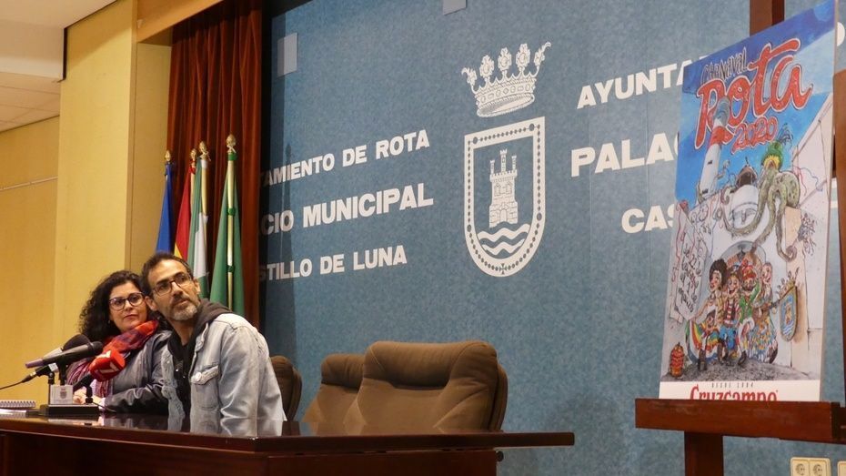 La delegada de Fiestas, Laura Almisas, acompañada por el ganador del concurso convocado para elegir el cartel, José Antonio Bellido, presentó la obra, elegida de entre nueve propuestas presentadas que, además de los 300 euros de premio para el creador, será el que anuncie que Rota está de Carnaval a finales de febrero.