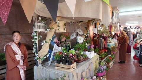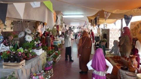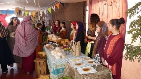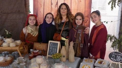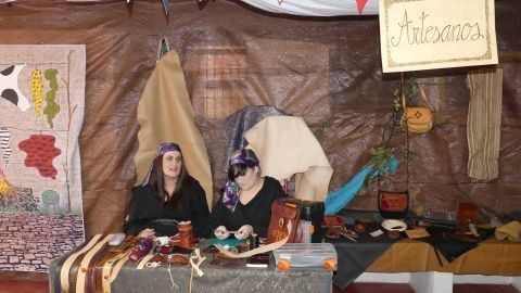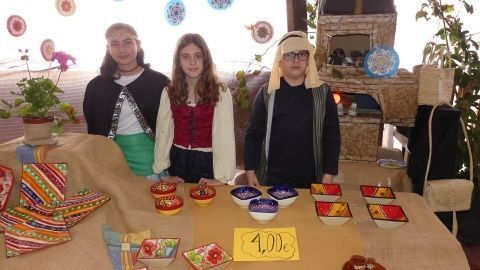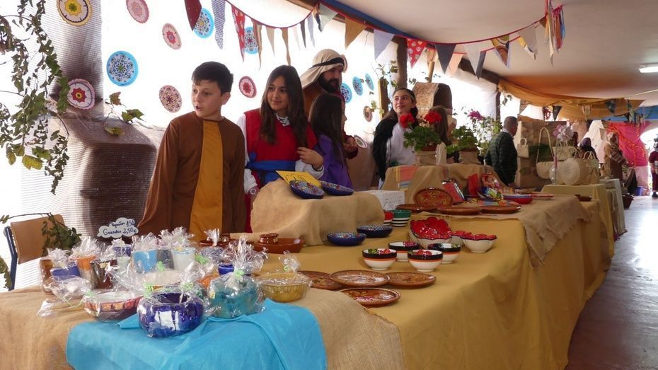 Desde luego, era admirable el trabajo de profesores, padres y colaboradores que en solo día y medio consiguieron ambientar una de las zonas comunes del patio en tenderetes en los que los alumnos incluso vendían a módico precio algunas manualidades hechas por ellos mismos en clase y productos con los que algunas empresas roteñas colaboraron poniendo a la venta quesos, chacinas, vinos, vinagres, flores, miel de Rota, artículos realizados a mano en madera, jabones, cerámica, etc. Todo ello en un ambiente andalusí en el que todos los figurantes iban ataviados para la ocasión y vendían productos desde sus puestecillos de carpintería, herrería, panadería, frutería, el telar y muchos otros a los que se sumaron como algo novedoso alumnos de talleres de la delegación del Mayor del Ayuntamiento de Rota que de esta manera quisieron participar y colaborar con la actividad. De hecho, en este particular mercado se pudo ver demostraciones de ganchillo, cuero, encaje de bolillos o artículos de empleita que los participantes en estos talleres realizaron a vista de todos ofreciendo así una visión de productos artesanales.