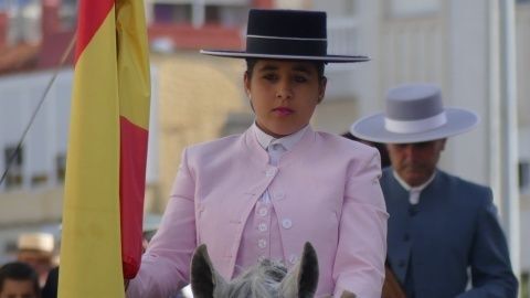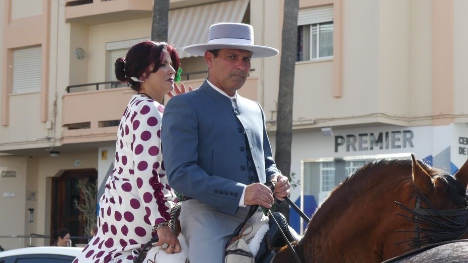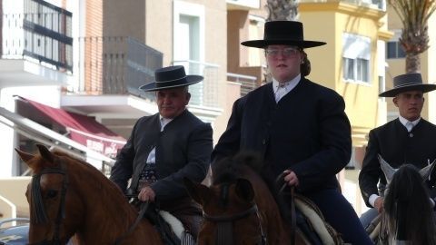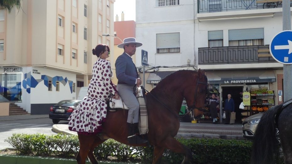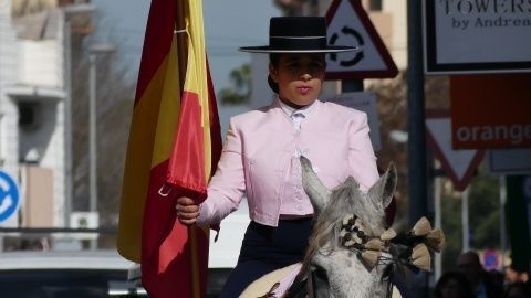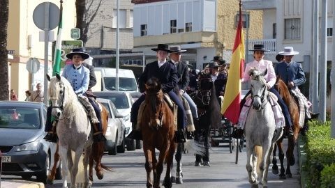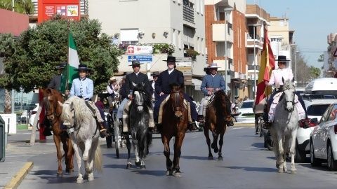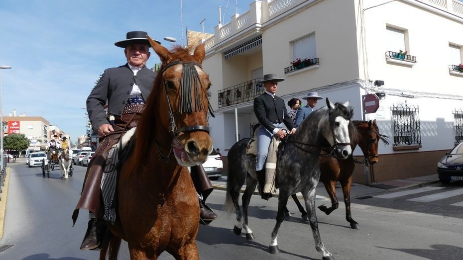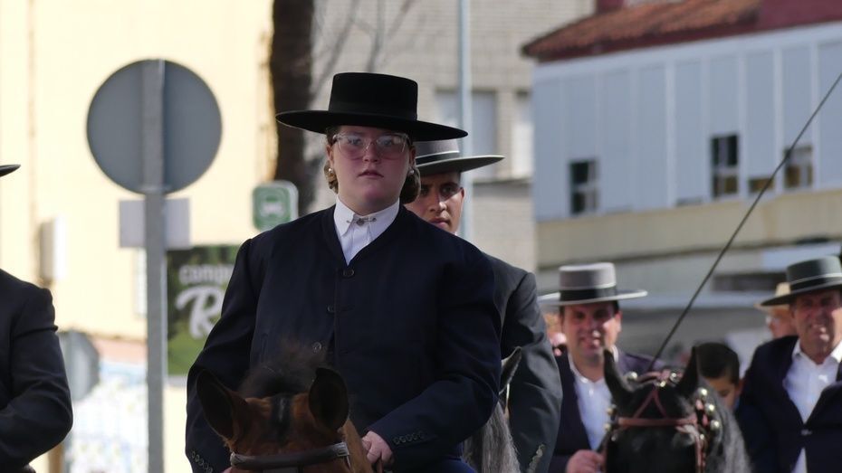 Abriendo la comitiva con las banderas de España y Andalucía, los caballistas de la asociación "La Posada" han pasado por varias calles y avenidas para llegar al recinto ferial donde tendrá lugar su jornada de convivencia con las exhibiciones de Rocío Benítez Rapozo, campeona de España y tricampeona de Andalucía, en doma de alta escuela; Miguel Ángel Tejero López y Fran Alba Moya en doma vaquera; Coto Caballero Sánchez en alta escuela y Paula Gutiérrez Acuña en doma clásica. Por otro lado, la bailaora Ofelia Màrquez actuará con sus alumnas de la academia.