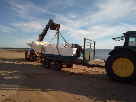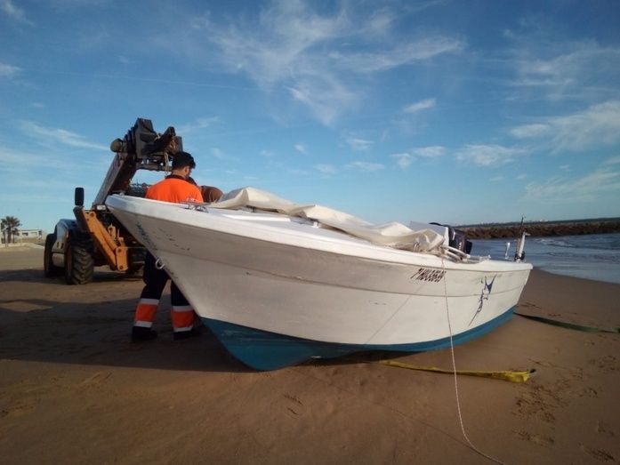 Los cuerpos de seguridad solicitaron la ayuda de la delegación de Playas del Ayuntamiento de Rota para poder trasladar la embarcación que quedó en la orilla de la playa de la Costilla, cerca del espigón del muelle pesquero.