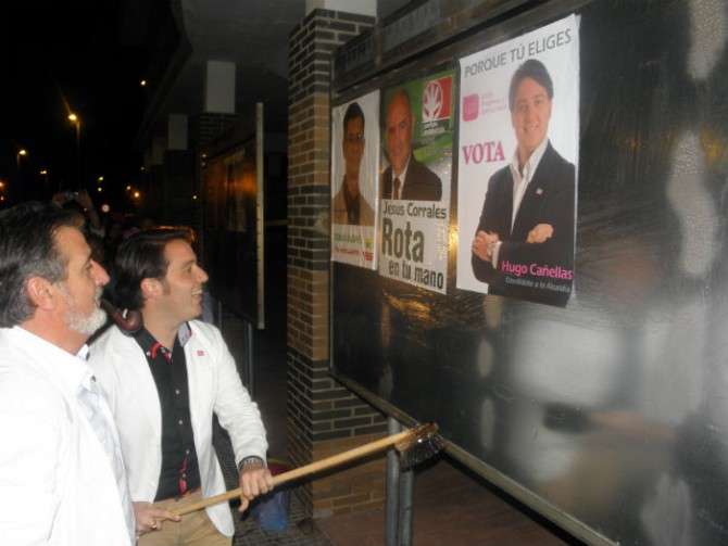 Las caras de Lorenzo Sánchez Alonso (Roteños Unidos), Encarnación Niño Rico (PSOE), Eva Corrales Caballero (Partido Popular), Manuel Helices Pacheco (Izquierda Unida), Hugo Cañellas Ávila (UPyD), Jesús Corrales Hernández (Partido Andalucista) y Manuel García Andrades (AIRE) inundan desde anoche las farolas y paneles de la localidad. Y es que mientras transcurría el acto simbólico de pegada de carteles junto al recinto ferial por parte de los alcaldables, el resto de afiliados y simpatizantes de cada partido, hacían su labor por las calles de Rota de modo que anoche, ya de madrugada, el aspecto de Rota no dejaba lugar a dudas de que estamos en campaña electoral.