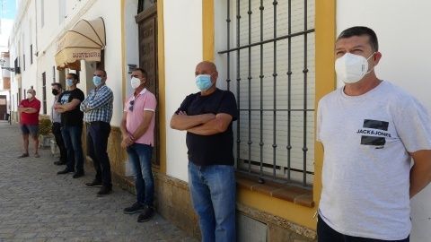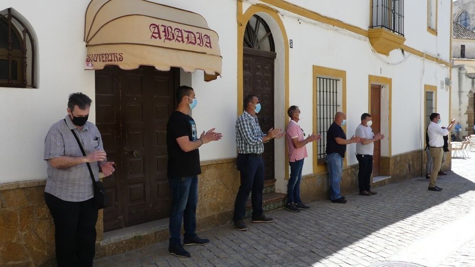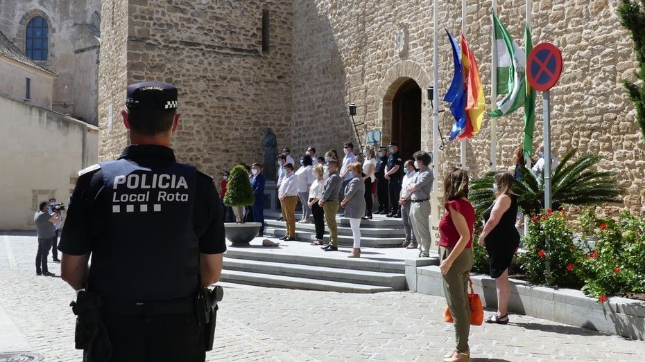 El alcalde de Rota, Javier Ruiz, y miembros de la Corporación municipal además de algunos empleados municipales y ciudadanos se han sumado esta mañana a la convocatoria de un minuto de silencio en recuerdo de las víctimas que han perdido la vida a causa del coronavirus. Un gesto simbólico que se ha llevado a cabo en la puerta de muchos ayuntamientos españoles ya que este es el primer día de luto oficial de los diez que se ha decretado por parte del Gobierno central y que terminará el 6 de junio.