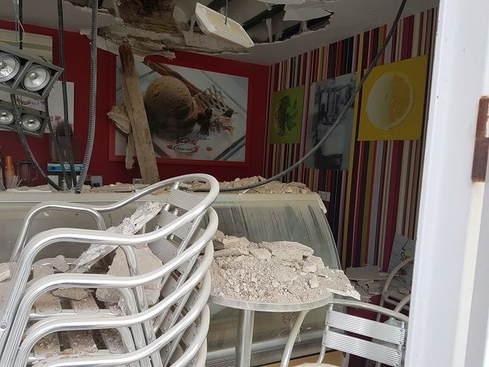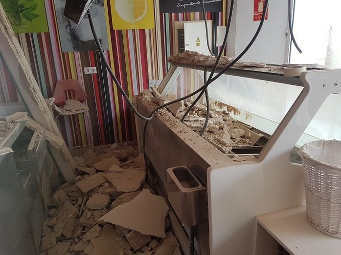 El derrumbe del suelo de la azotea del número 2 de la calle Pérez de Bedoya que se produjo sobre las 3 de la pasada madrugada y causó daños en la vivienda de la primera planta y en el local comercial de la planta baja, ha dejado importantes daños estructurales al punto de que la heladería que se preparaba para abrir sus puertas la próxima semana con la llegada de la temporada alta, no podrá hacerlo. Es más, a lo largo de esta mañana, y en vista de la situación, tal y como ha manifestado a este medio su propietario, ha desalojado el local ante el temor de que su maquinaria corra aún más peligro y daños de los que ya ha sufrido el local que se ha visto seriamente afectado.