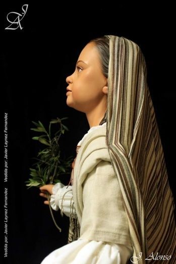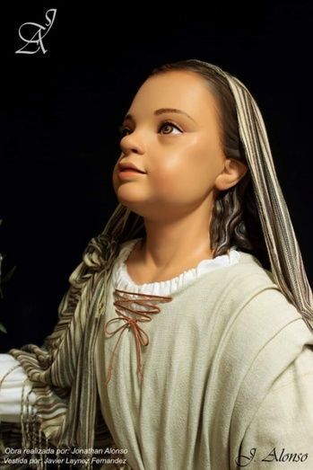 Para su talla, Jonathan Alonso tomó de modelo a una joven roteña, cuyo nombre el autor ha querido reflejar escrito en hebreo en el broche de su pelo, que a su vez, lleva los que se identifican a las asociaciones de Down, el azul y amarillo. En este caso, se ha usado el oro amarillo.