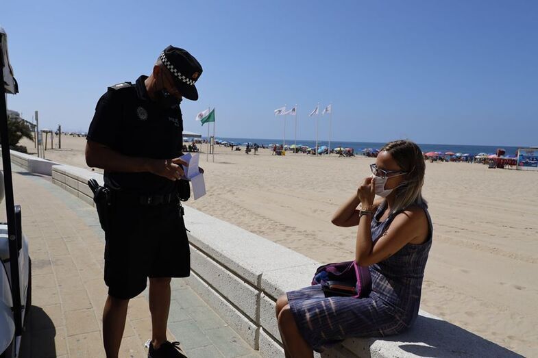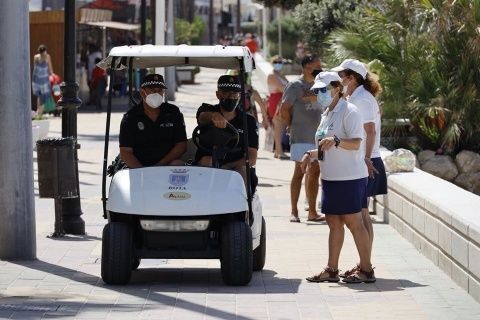 Si observamos la foto justo donde esta el carrito de golf de los polis existe un bar, si te sientas solo o sola como la señora en el muro sin mascarilla cuesta 100 euros, pero si te sientas enfrente en la terraza del bar 1,50 el pikislavis que te tomes, hay que fomentar el comercio, y justo en la arena hace días robaron móviles y bolsos en la arena y no se pilla a nadie, así es la vida, todo un simulacro cuando llega el momento de la verdad, "......., aquí lo que vale son los 100 euros para las nóminas que esta cosa chunga