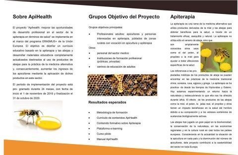 Con este proyecto se pretende elaborar un programa de capacitación en Apiterapia, basado en contenidos on-line, destinado a apicultores, personas interesadas en apiterapia y medicina alternativa, al sector sanitario y a las instituciones de enseñanza y formación profesional. Los interesados pueden informarse sobre esta iniciativa en el enlace de la página web Proyecto ApiHealth.