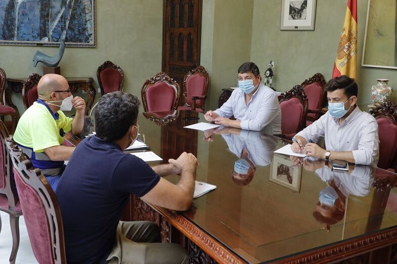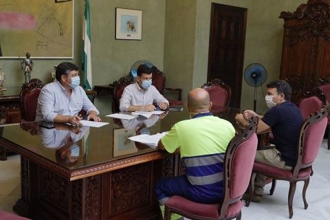 El primer teniente de alcalde de Rota, Daniel Manrique, junto al delegado municipal de limpieza y servicios generales, Jesús López, han recibido esta mañana en el Palacio Municipal Castillo de Luna a una representación de los trabajadores de la UTE URDRA Ballena, unión temporal de empresas, liderada por Urbaser y encargada del servicio de suministro de agua y recogida de residuos sólidos urbanos (RSU) en Costa Ballena, debido al conflicto laboral que ha llevado convocar movilizaciones desde comienzos de esta semana.