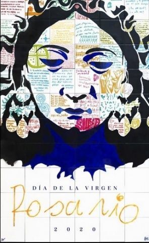 Los jóvenes artistas Mario Muñoz y Santiago Liaño han sido los encargados de elaborar un cartel muy diferente al de años anteriores. Han elegido 60 azulejos, en los que han pintado la cara de la virgen del Rosario con acrílico, pero la originalidad no radica en que el cartel sea de este material, sino que en esos azulejos, 36 personas han podido dejar por escrito de puño y letra lo que significa para ellas la patrona.