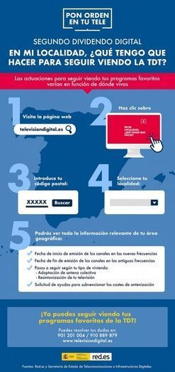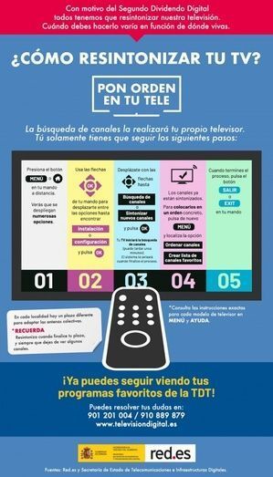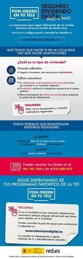Los próximos días 1, 7 y 14 de octubre se producirá, en 5.019 municipios incluidos en 38 áreas geográficas de las 75 establecidas en el Plan Técnico Nacional de la Televisión Digital Terrestre, el cese de emisiones de algunos canales en sus antiguas frecuencias de la TDT y solo se podrán seguir viendo por las nuevas. En la provincia de Cádiz, los municipios afectados verán este cambio en la noche del 13 al 14 de octubre. Por ello, los edificios de tamaño mediano y grande habrán tenido que adaptar su instalación de antena y toda la ciudadanía deberá resintonizar sus televisores con el mando a distancia, independientemente del tipo de vivienda en la que resida.