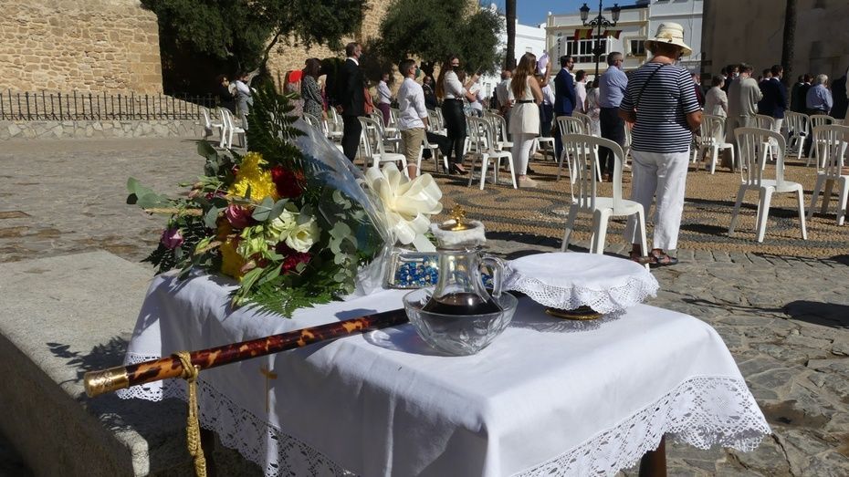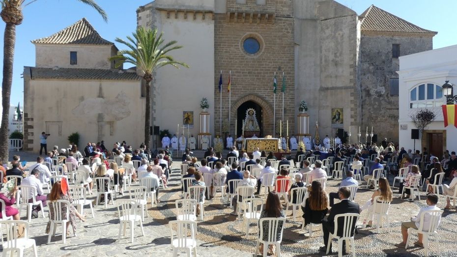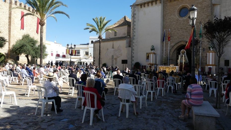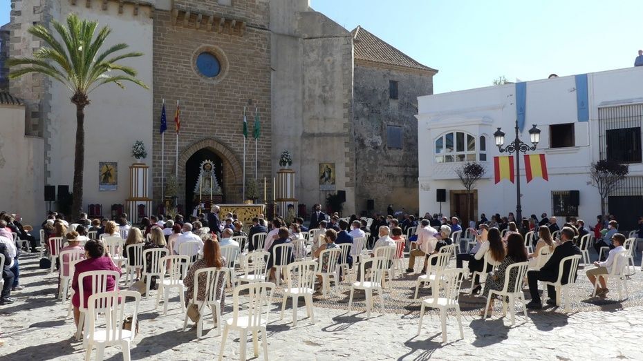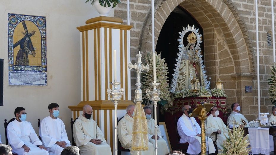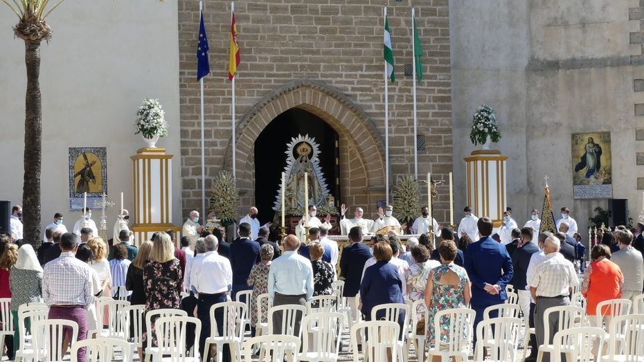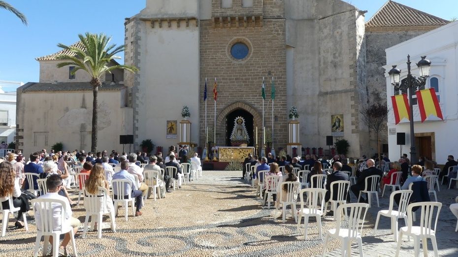 Bajo un sol que apretaba con ganas, la imagen de Nuestra Señora del Rosario ha salido a la puerta de la parroquia de Nuestra Señora de la O en la misma parihuela en la que ha peregrinado hasta en dos ocasiones a Costa Ballena. Luciendo su saya de coronación, el manto blanco de tisú, con los bordados más antiguos que posee la Hermandad del Rosario, y la corona de oro recién restaurada gracias a aportaciones y donaciones de fieles y devotos, la patrona ha presidido la misa oficiada por el cura párroco de la O, José Arjona Gil, acompañado por los párrocos del resto de iglesias de la localidad, seminaristas y diáconos.
