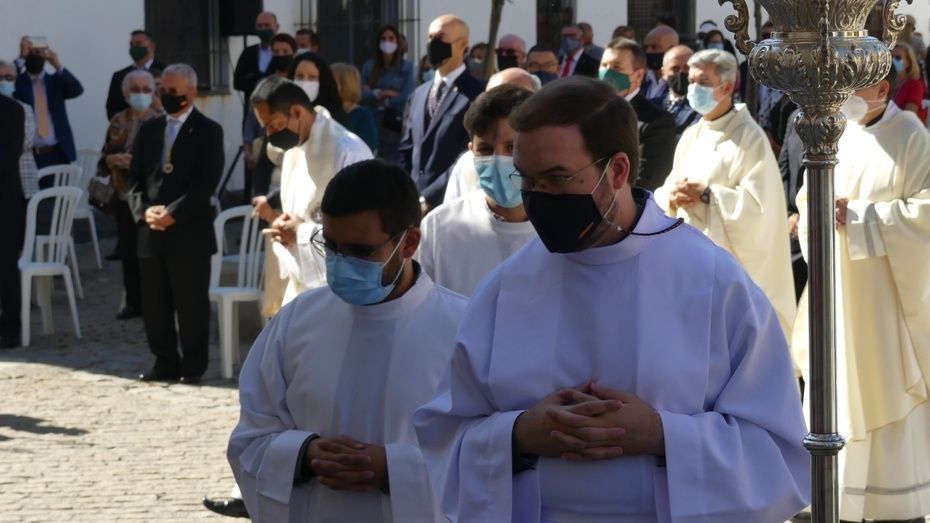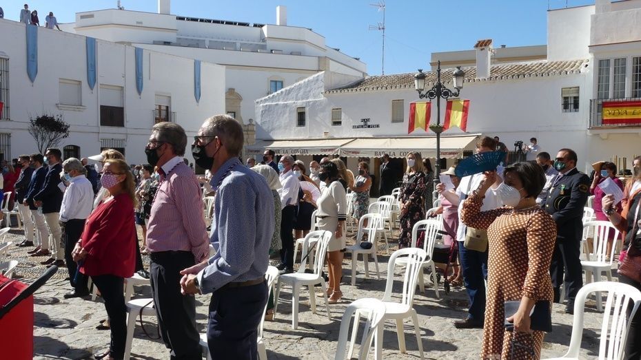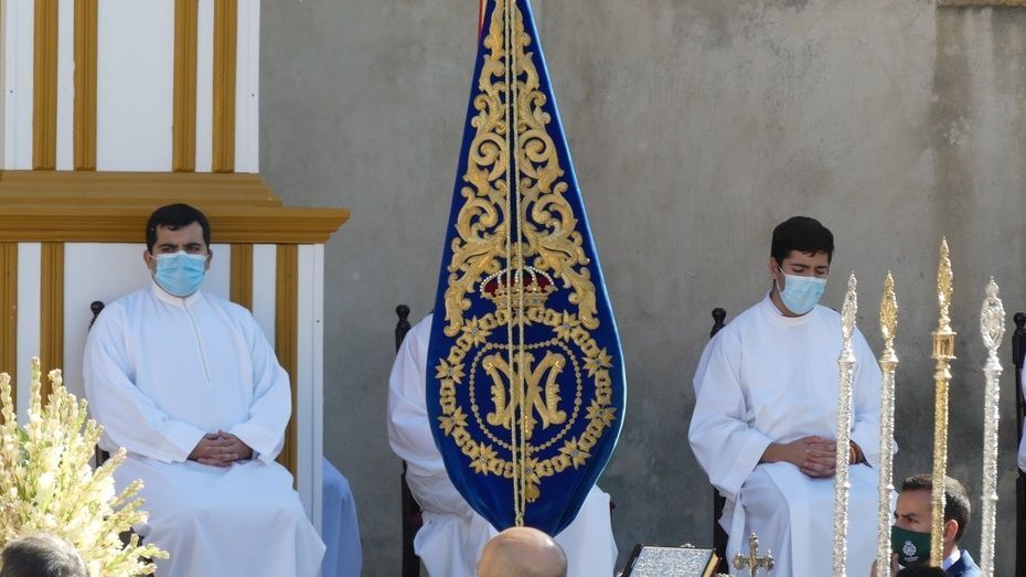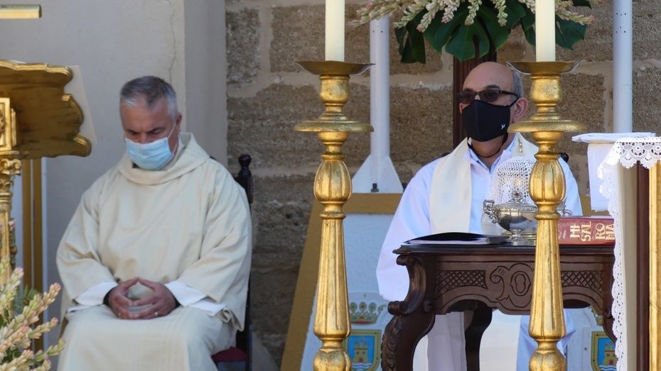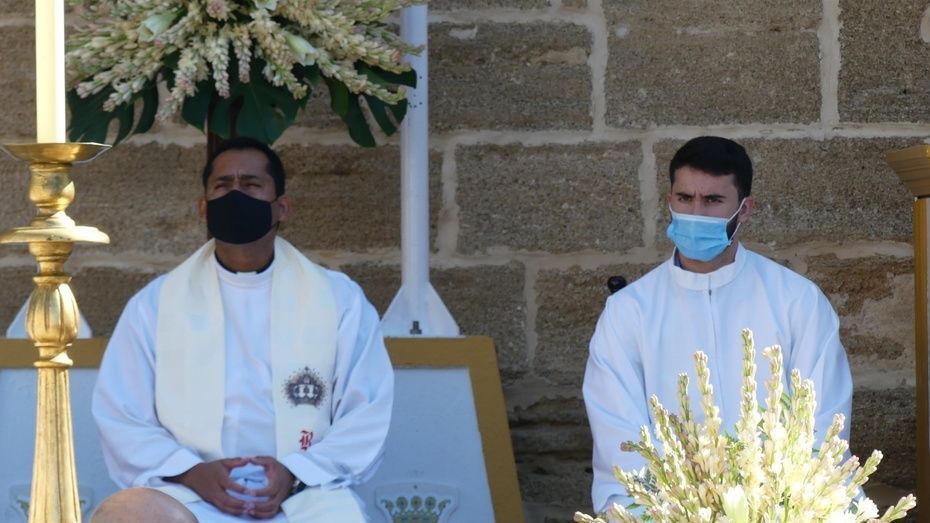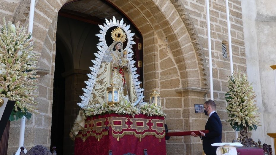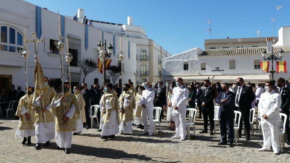 Bajo un sol que apretaba con ganas, la imagen de Nuestra Señora del Rosario ha salido a la puerta de la parroquia de Nuestra Señora de la O en la misma parihuela en la que ha peregrinado hasta en dos ocasiones a Costa Ballena. Luciendo su saya de coronación, el manto blanco de tisú, con los bordados más antiguos que posee la Hermandad del Rosario, y la corona de oro recién restaurada gracias a aportaciones y donaciones de fieles y devotos, la patrona ha presidido la misa oficiada por el cura párroco de la O, José Arjona Gil, acompañado por los párrocos del resto de iglesias de la localidad, seminaristas y diáconos.