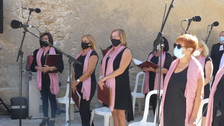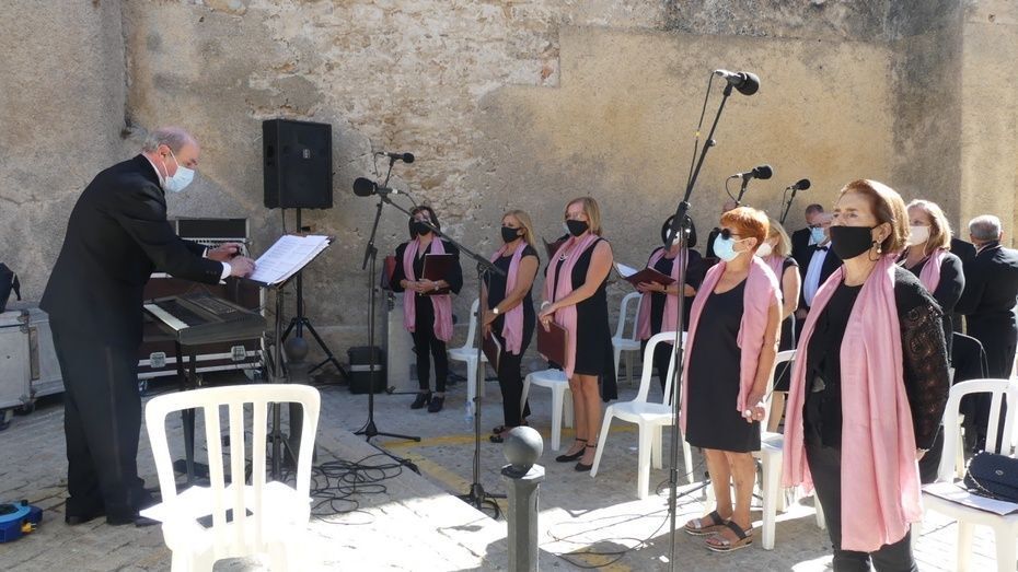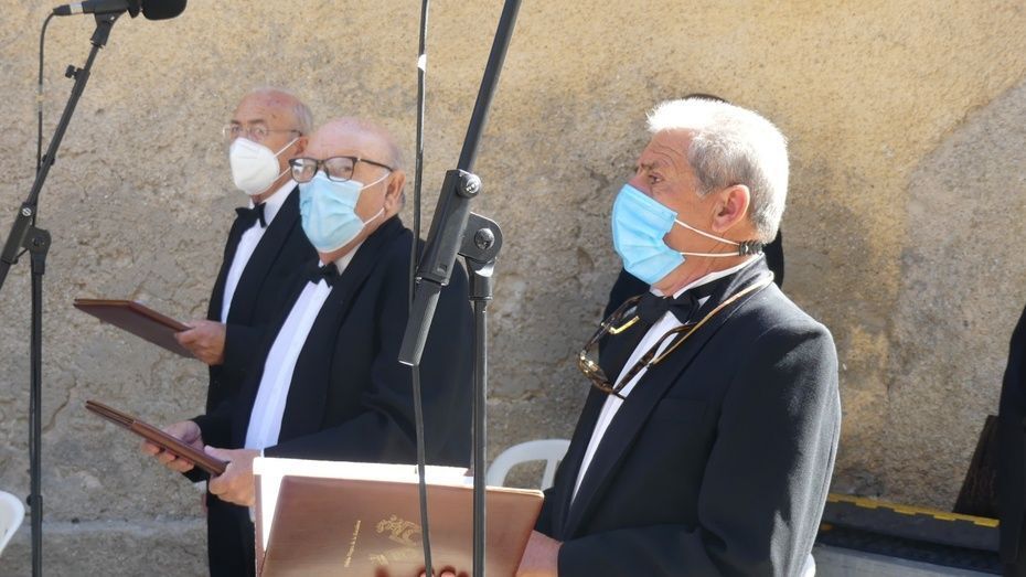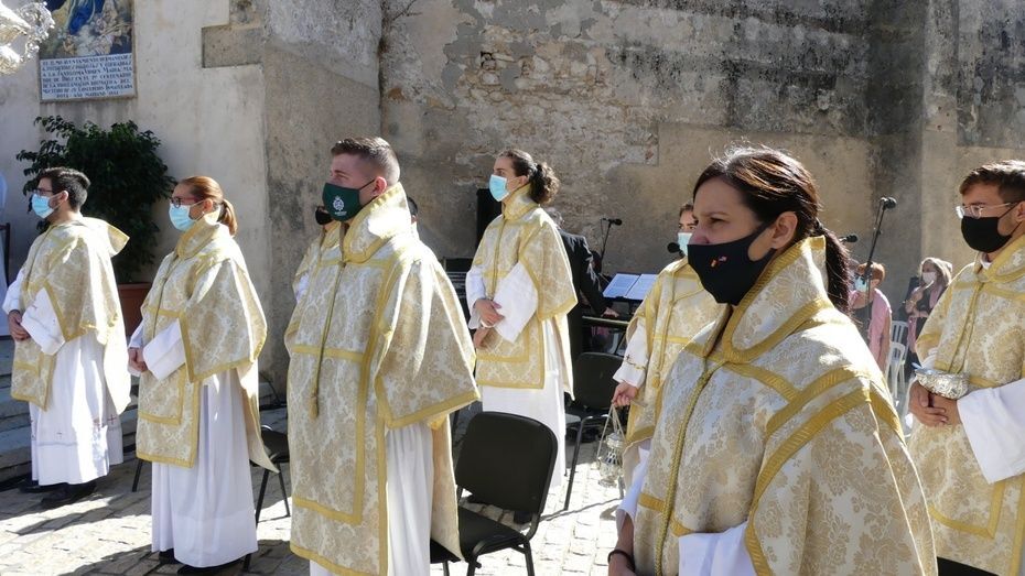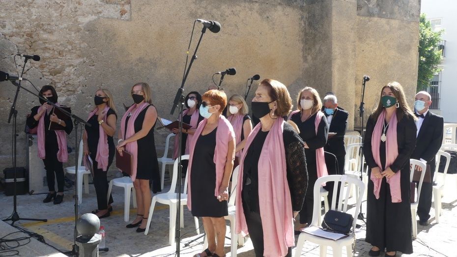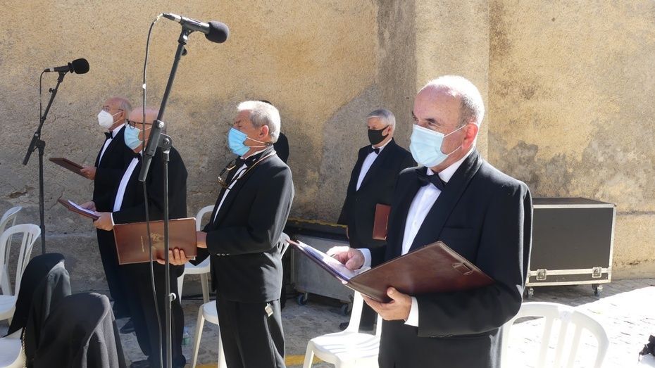 El orfeón "Virgen de la Escalera" ha sido el encargado de poner la nota musical a esta cita religiosa que en términos normales se hubiera celebrado en el interior de la parroquia de la O, pero que con la crisis sanitaria, para dar algo de realce al día de la patrona, se elegía hacerla a aire libre en una plaza que se ha mostrado engalanada para la ocasión.
