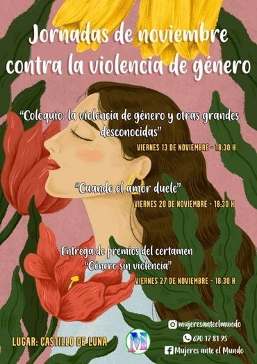 Las jornadas terminarán el día 29 de noviembre a las 11.00 horas, con la entrega de premios del Certamen Literario "Género sin violencia" que se convoca también este año por segunda vez ante la buena respuesta del año pasado. En él se leerán los relatos ganadores de esta edición que queda convocada para aquellos amantes de la escritura que quieran participar en una cita literaria en la que la violencia de género y la reflexión sobre la cruda realidad que viven millones de mujeres en el mundo debe ser el eje de las obras presentadas, según indica la Asociación Mujeres ante el Mundo.