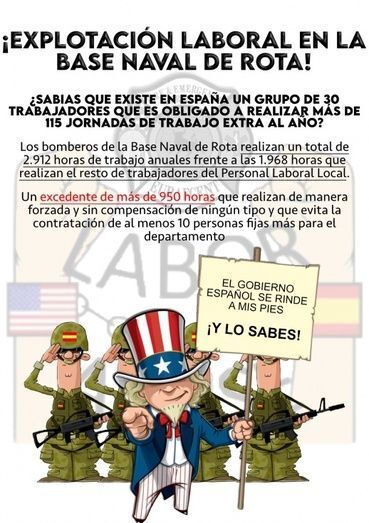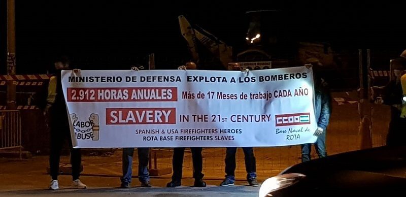 [Img #139027]Con el lema "El Ministerio de Defensa explota a los bomberos. 2.912 horas anuales, esclavitud en el siglo 21”, recogen su sentir ante una situación laboral que les lleva a veces, a empalmar jornadas de hasta 72 horas por la falta de personal.  En sus cuentas, les sale trabajar 2.912 horas anuales cuando el Estatuto de los Trabajadores y su convenio colectivo establece para el resto de los trabajadores PLL (Personal Laboral Local) al servicio de la administración USA una jornada laboral anual de 1.968 horas.
