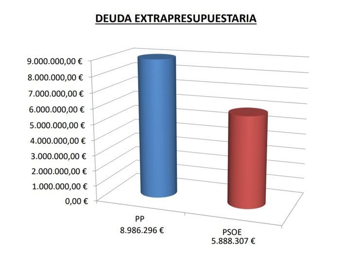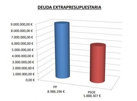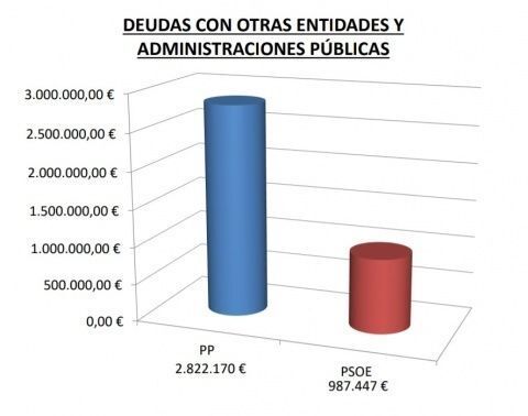 De la deuda extrapresupuestaria, es decir, aquellos gastos que se hicieron sin consignación presupuestaria, el PP dejó un impago de 8.986.296 euros, de los que quedan 5.888.307 euros, es decir, que se han pagado 3 millones de euros. Igual ocurre con las deudas con otras entidades y administraciones públicas que tenía el Ayuntamiento, cifradas en 2015 en 2.822.170 euros, de los que quedarían 987.447 euros.