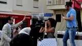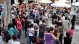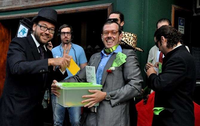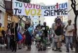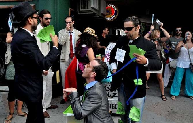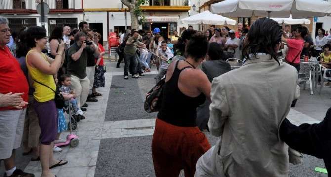 Durante todo el recorrido, los participantes en el happening, la mayoría jóvenes actores roteños, fueron dando vida a personajes como el director del Fondo Monetario Internacional, políticos que iban comprando votos por la calle a cambio de dinero, o a un obrero que arrastrando un monolito, representaba la carga de la que hoy tiran muchas familias. Las escenas eran bastante ocurrentes y entretenidas. Perseguían interactuar con los ciudadanos para los que no pasó desapercibida esta situación, de hecho, fueron muchos los que se sumaron a lo largo de todo el pasacalles hasta llegar a la plaza de España en la que se reunieron más de 200 personas.
