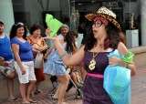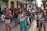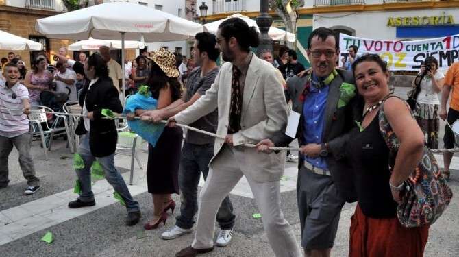 Hasta ahora, todos los días a las ocho de la tarde, la asamblea de Rota se concentra en la plaza de España para ir tomando decisiones al hilo de lo que va ocurriendo en Madrid, punto neurálgico de las concentraciones del movimiento bautizado como 15-M, pero ayer, la cita fue distinta. La comisión de arte de esta plataforma ciudadana decidió tomar el centro de la localidad al ritmo de la batukada que abriendo la comitiva, contribuyó a que gente que se encontraba paseando por el centro se sumara a la iniciativa. Desde el Pasaje del Carnaval, en la zona de la Costilla, hasta la plaza de España, el happening fue el centro de todas las miradas. Y es que muchos de los que escenificaban esa manifestación artistística en contra de los banqueros y políticos corruptos no olvidaron ningún detalle ante la sorpresa de los que paseaban tranquilamente.