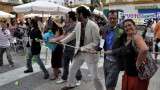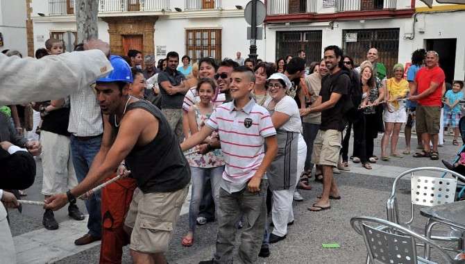 Una vez allí, las interpretaciones continuaron y para escenificar que el pueblo unido puede contra los banqueros, políticos corruptos o contra la forma de actuar del propio gobierno o el Fondo Monetario Internacional, se llevó a cabo una lucha de cuerdas. En un extremo, roteños anónimos que quisieron sumarse a la reivindicación, del otro, los personajes ya mencionados contra los que lucha el 15-M. En esa lucha ganó el lado del pueblo con lo que la moraleja estaba clara, si los ciudadanos se unieran, se podría luchar para cambiar el sistema, instalar uno más participativo y democráticamente más real que no diera cobertura a la corrupción.
