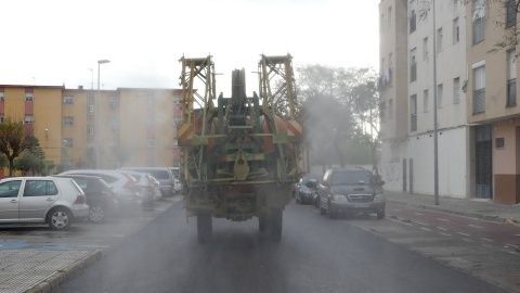 Los militares de Infantería de Marina de San Fernando llegan a Rota por primera vez para desinfectar espacios públicos.