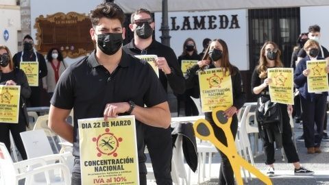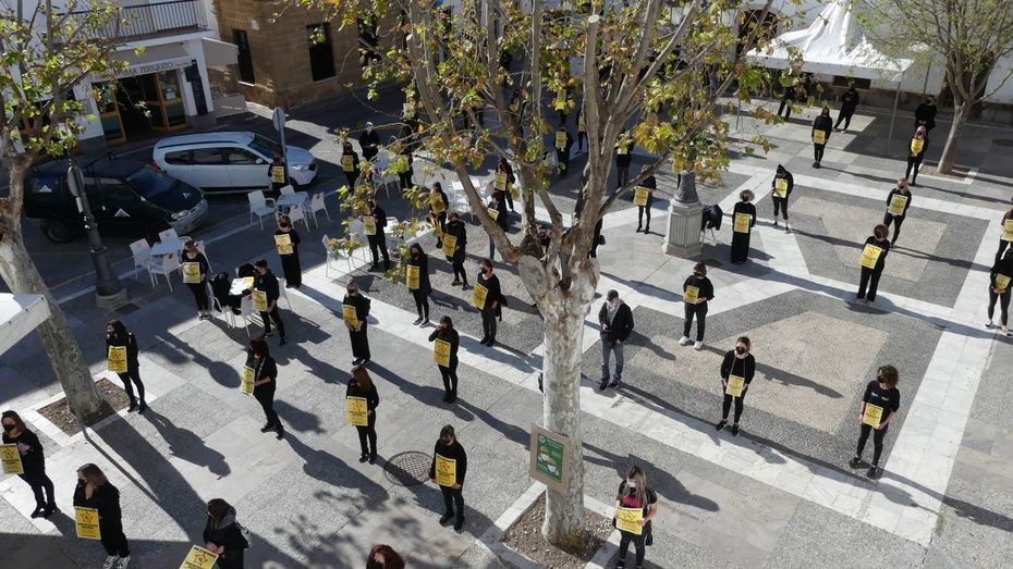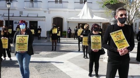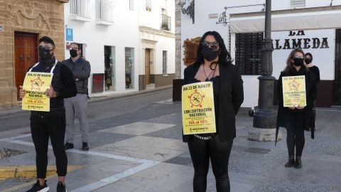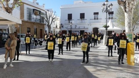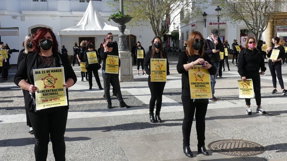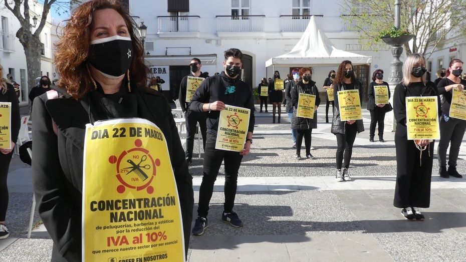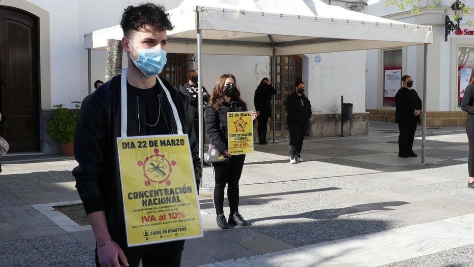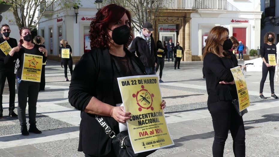 De negro, en absoluto silencio y con carteles amarillos pidiendo la bajada del IVA al 10% para el sector de la imagen personal, han estado esta mañana en la plaza de España peluqueros, barberos y esteticistas roteños concentrados. De esta forma, se han sumado a la protesta a nivel nacional que hoy se celebraba a la misma hora en 100 ciudades españolas.