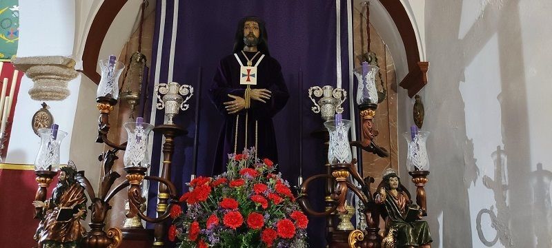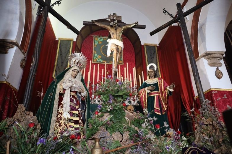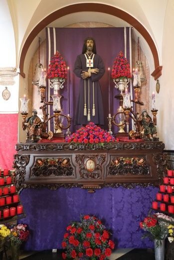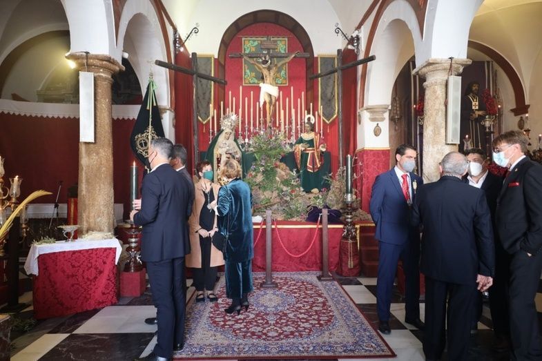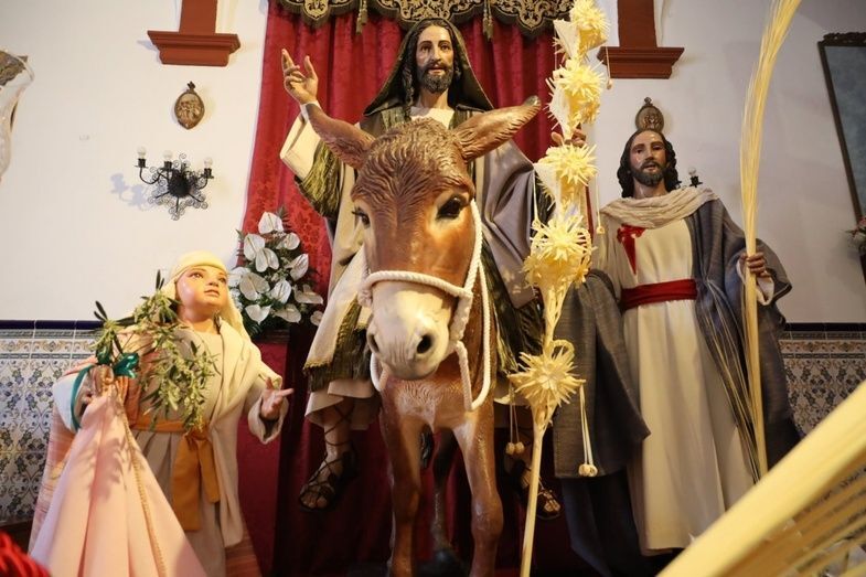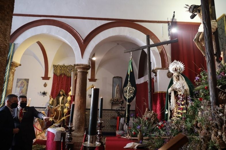 Los titulares de esta hermandad, la única que procesiona tres veces en estos días tan especiales para los cristianos, lucen engalanados en esta pequeña ermita que hoy estará abierta en un horario más amplio para que aquellos que los deseen puedan disfrutar de las imágenes de Nuestro Padre Jesús de la Paz en su Triunfal Entrada en Jerusalén, Nuestro Padre Jesús Cautivo, María Santísima de las Angustias, el Santísimo Cristo de la Veracruz y San Juan.