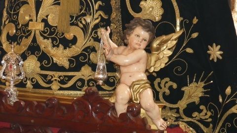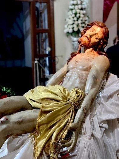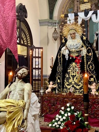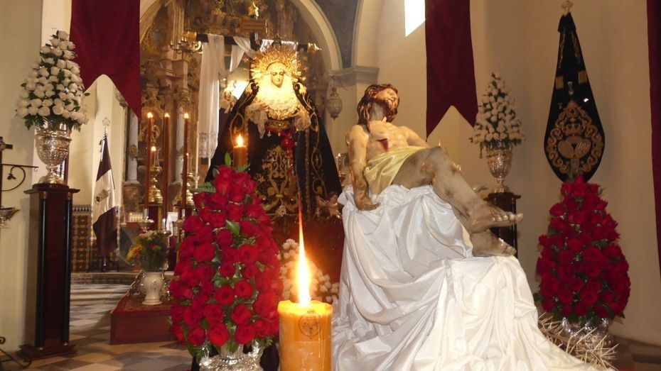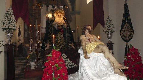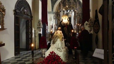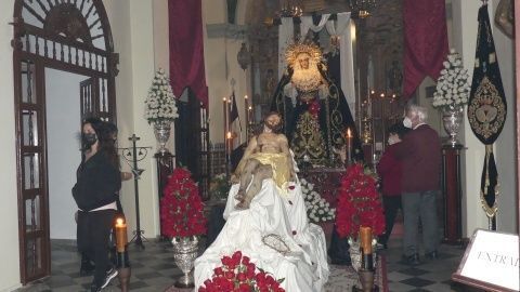 La capilla del Santo Entierro luce bonita, con un Cristo Yacente en el centro, a los pies de su madre, Soledad de María Santísima. Con luz tenue se iluminan los rostros de madre e hijo y ayuda a una visita con recogimiento y luto propio de un Viernes Santo que por otro lado, está deseando vivirse con ambiente.